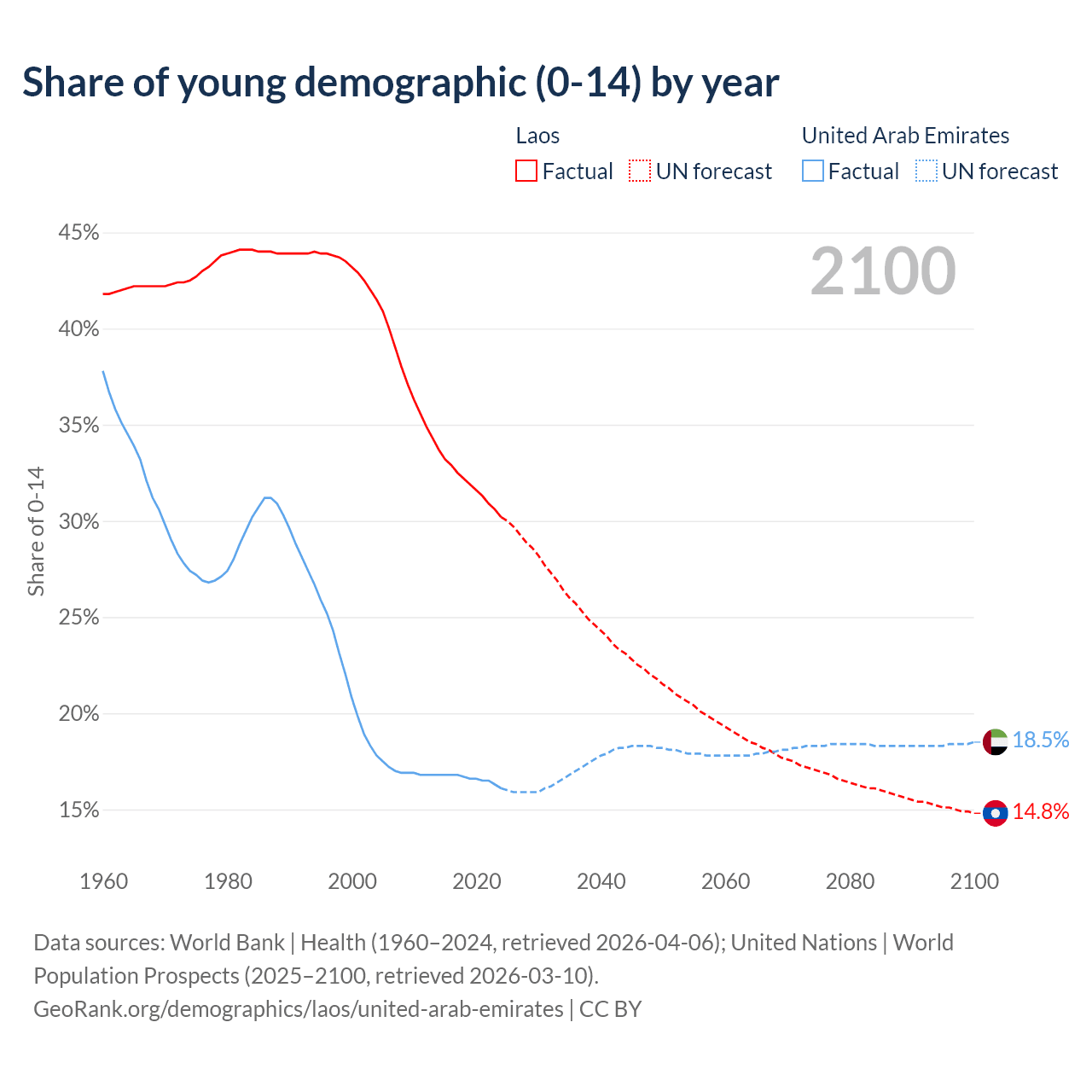 - The share of young demographic (0-15 years old) in Laos is 30.2% vs 16.1% in the United Arab Emirates.