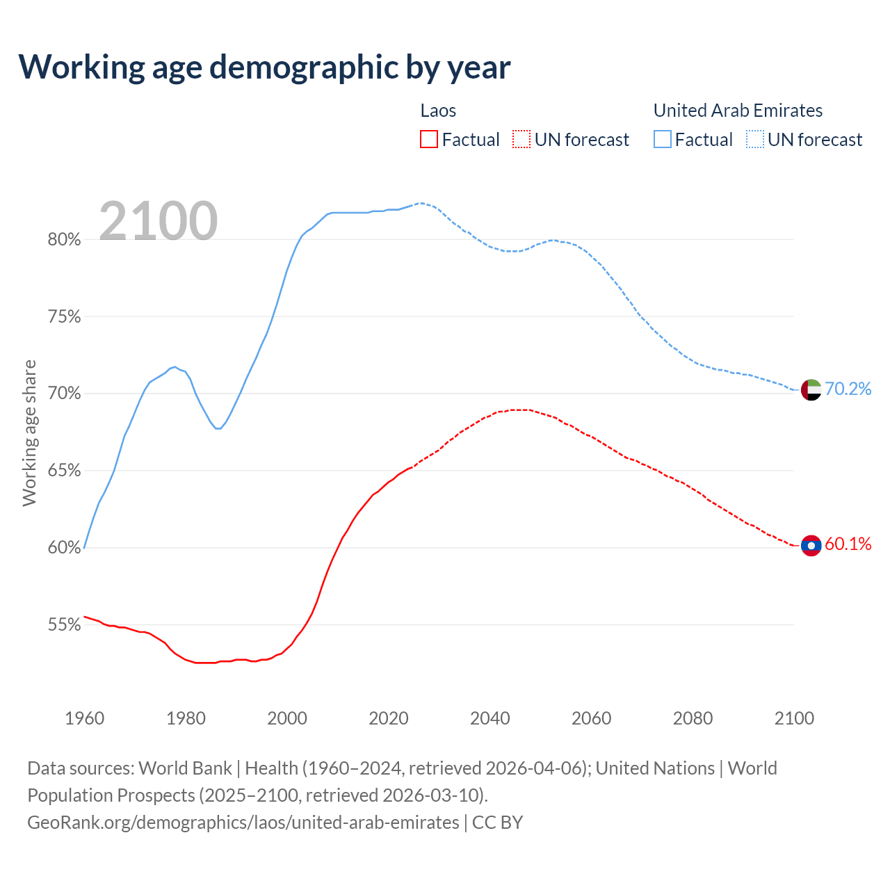 - Laos has 5.21M working age adults (aged 15-64) vs 9.6M in the United Arab Emirates.