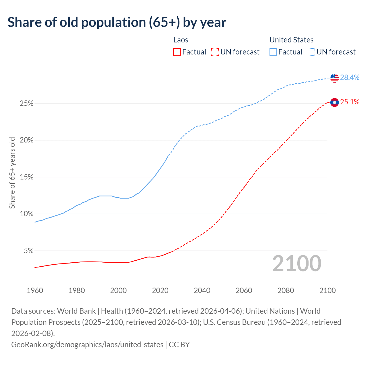 The share of older people aged 65 and over is 4.67% in Laos and 17.9% in the United States. Life expectancy in Laos compared to the United States .