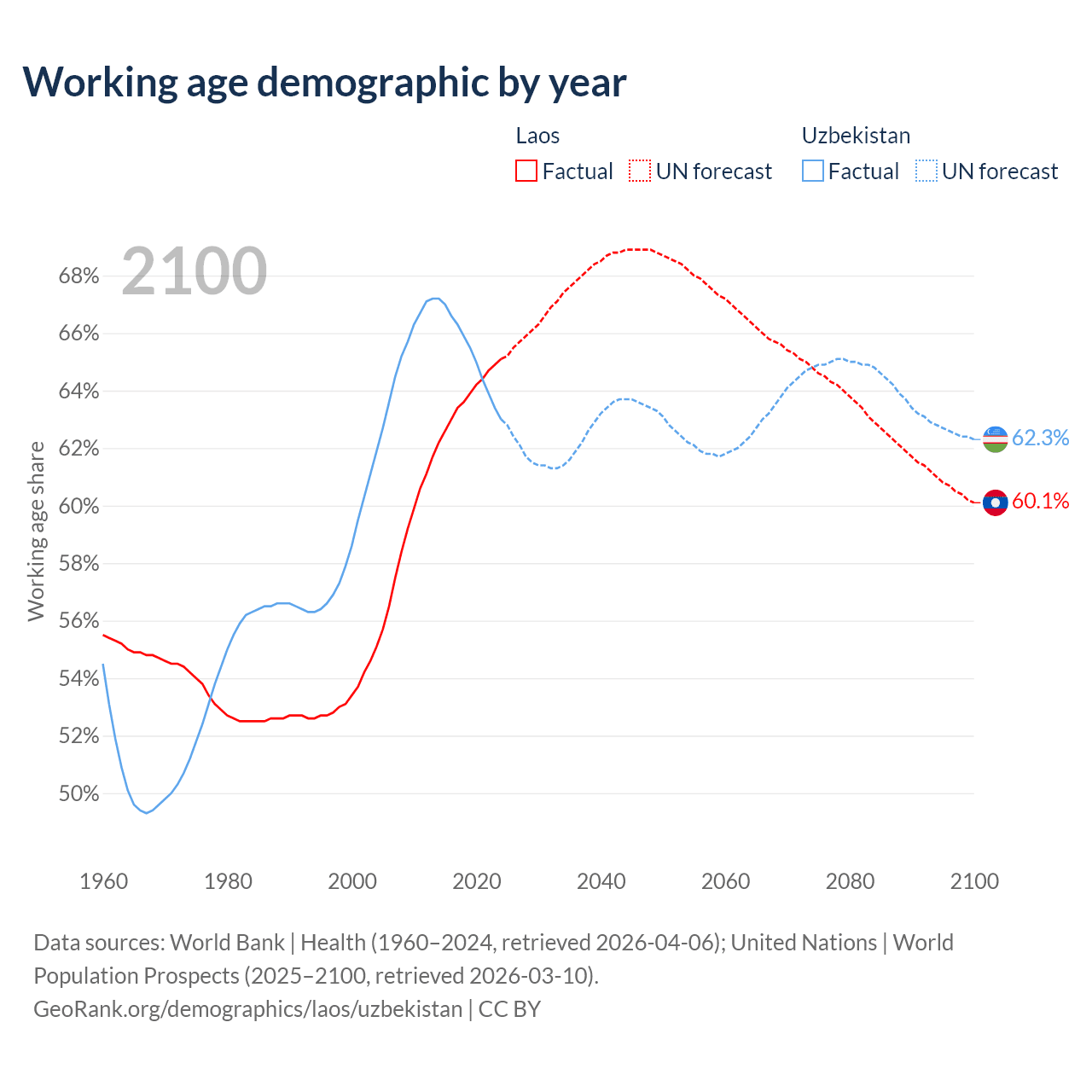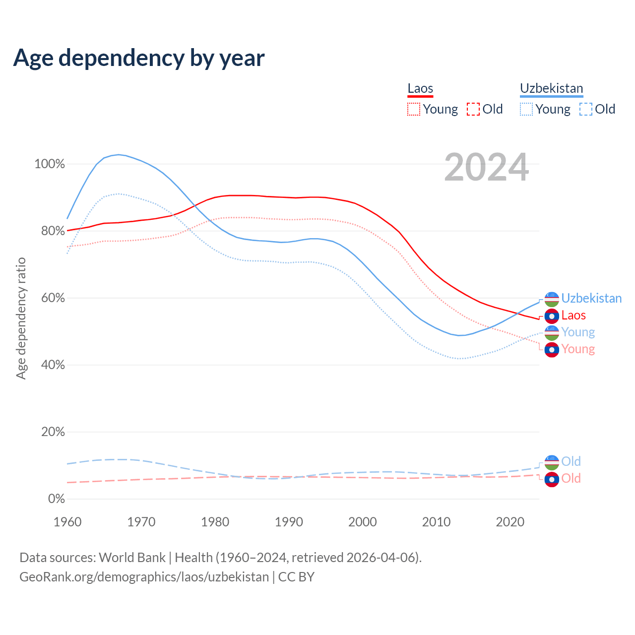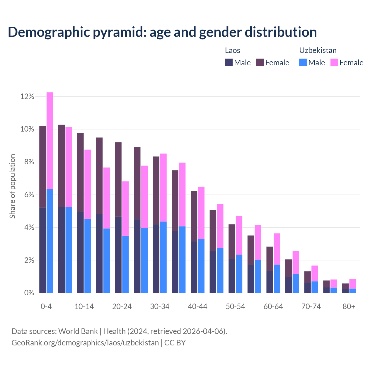 - Laos is ranked 130/196 by median age (oldest to youngest) vs 116/196 for Uzbekistan.