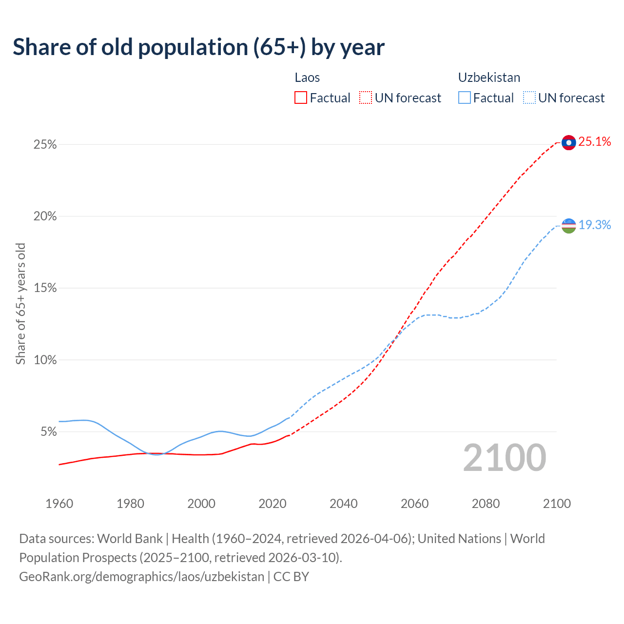 - The share of old-age demographic (65+) in Laos is 4.67% vs 5.86% in Uzbekistan.