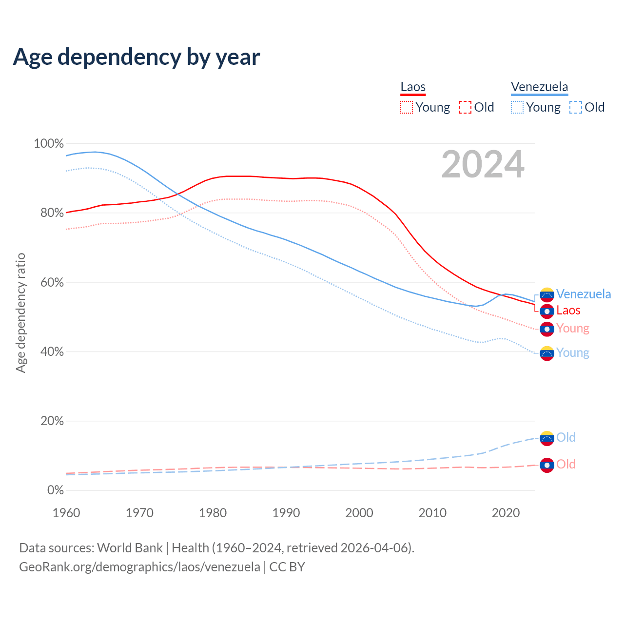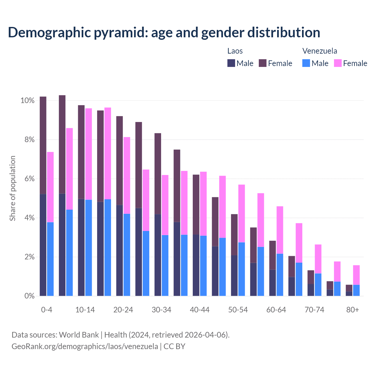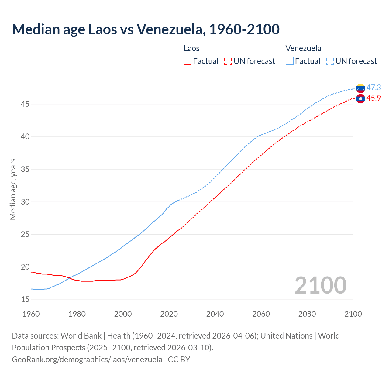- Laos is ranked 130/196 by median age (oldest to youngest) vs 104/196 for Venezuela.