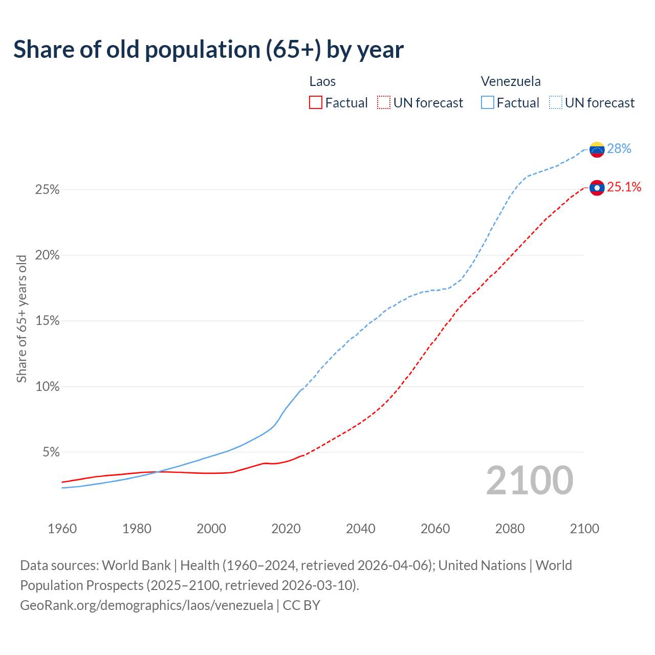 - The share of old-age demographic (65+) in Laos is 4.67% vs 9.68% in Venezuela.