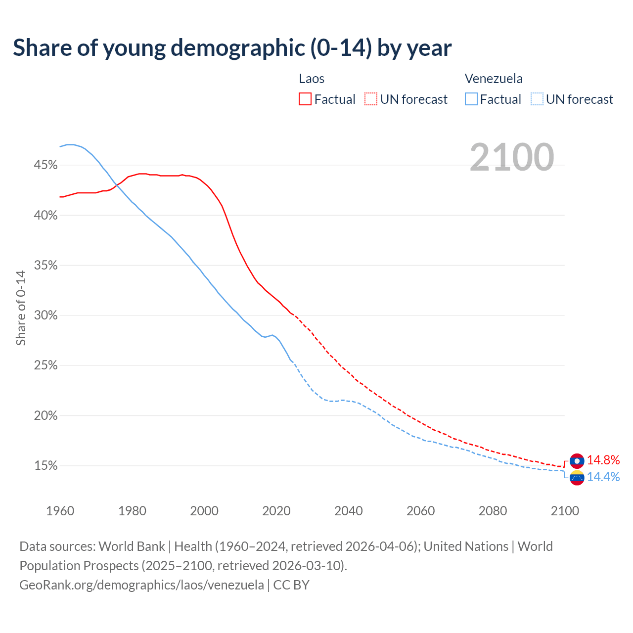 - The share of young demographic (0-15 years old) in Laos is 30.2% vs 25.5% in Venezuela.