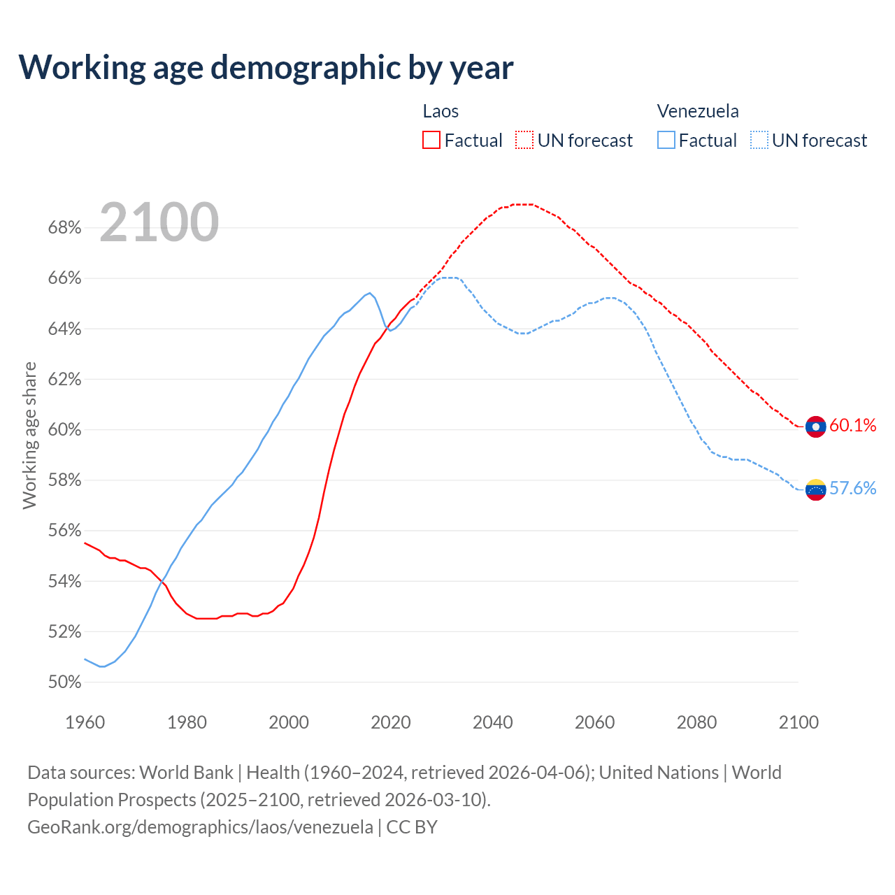 - Laos has 5.21M working age adults (aged 15-64) vs 18.6M in Venezuela.
