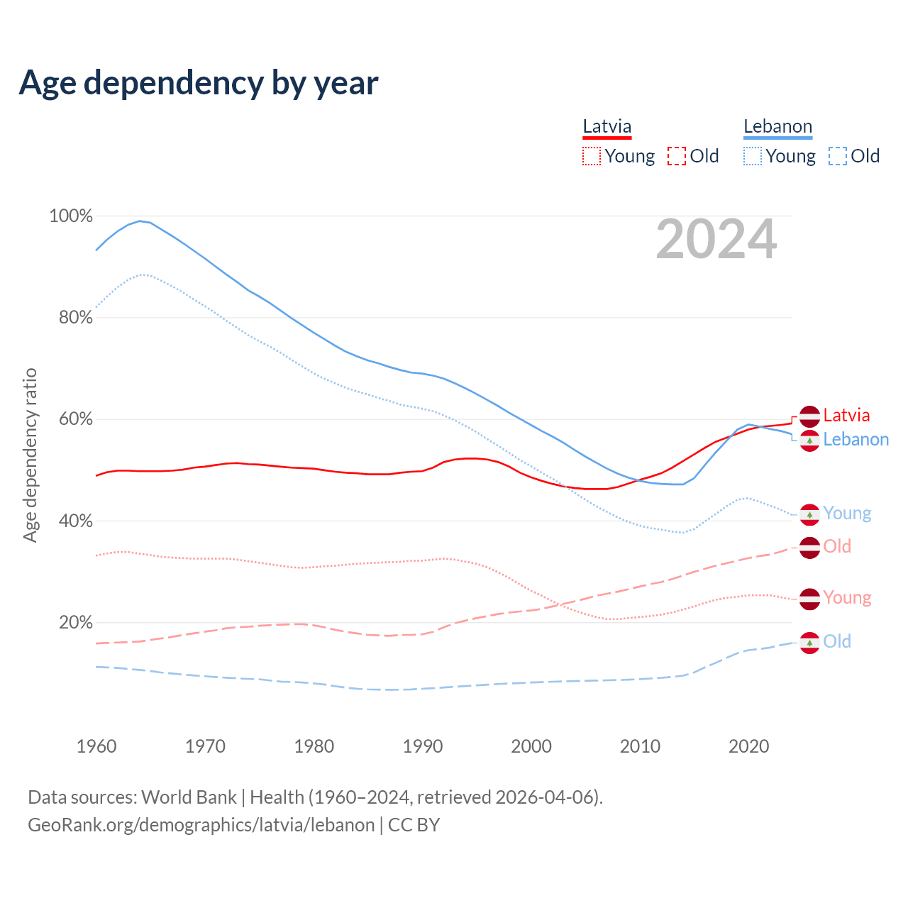 - Latvia is ranked 20/196 by median age (oldest to youngest) vs 106/196 for Lebanon.