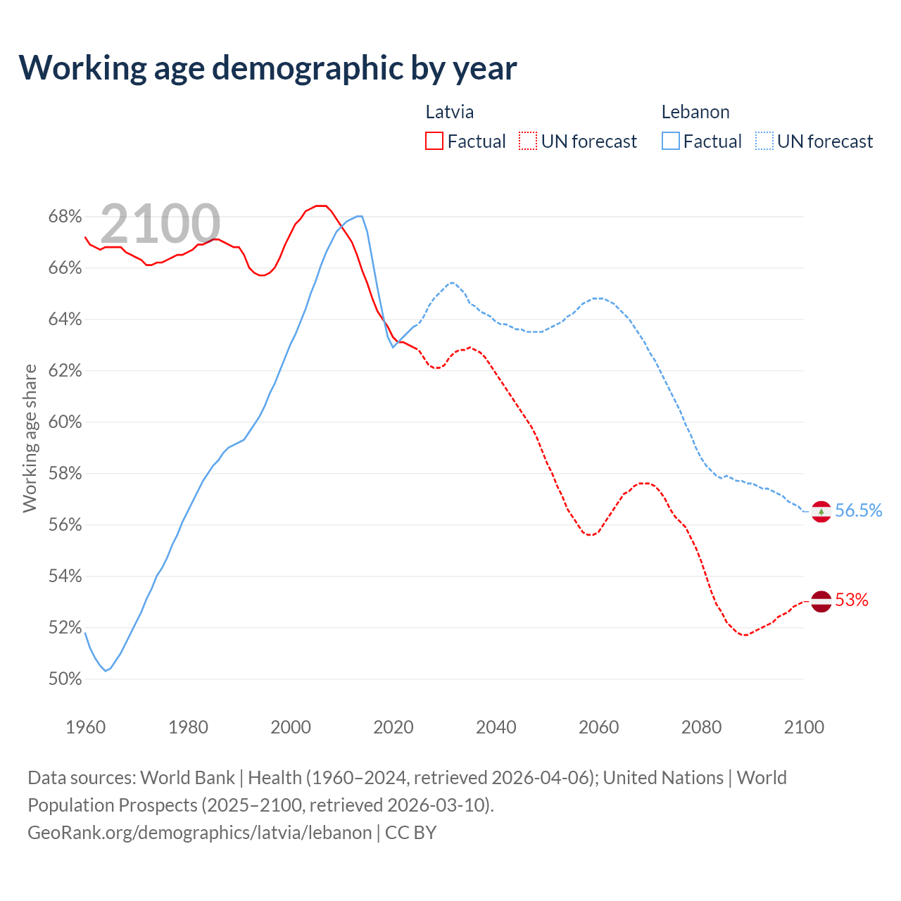 - Latvia has 1.15M working age adults (aged 15-64) vs 3.76M in Lebanon.
