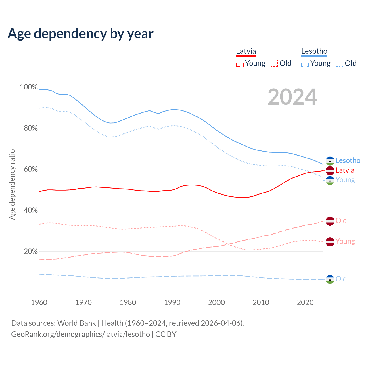 - Latvia is ranked 20/196 by median age (oldest to youngest) vs 143/196 for Lesotho.