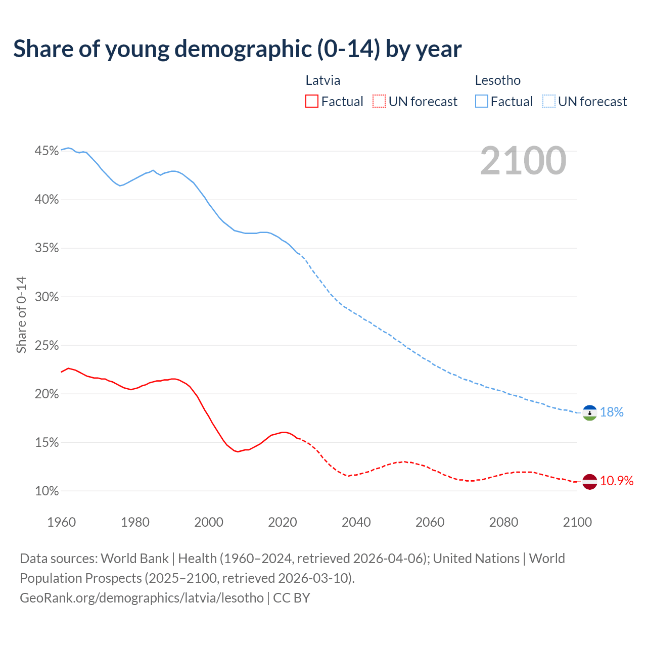 - The share of young demographic (0-15 years old) in Latvia is 15.4% vs 34.5% in Lesotho.