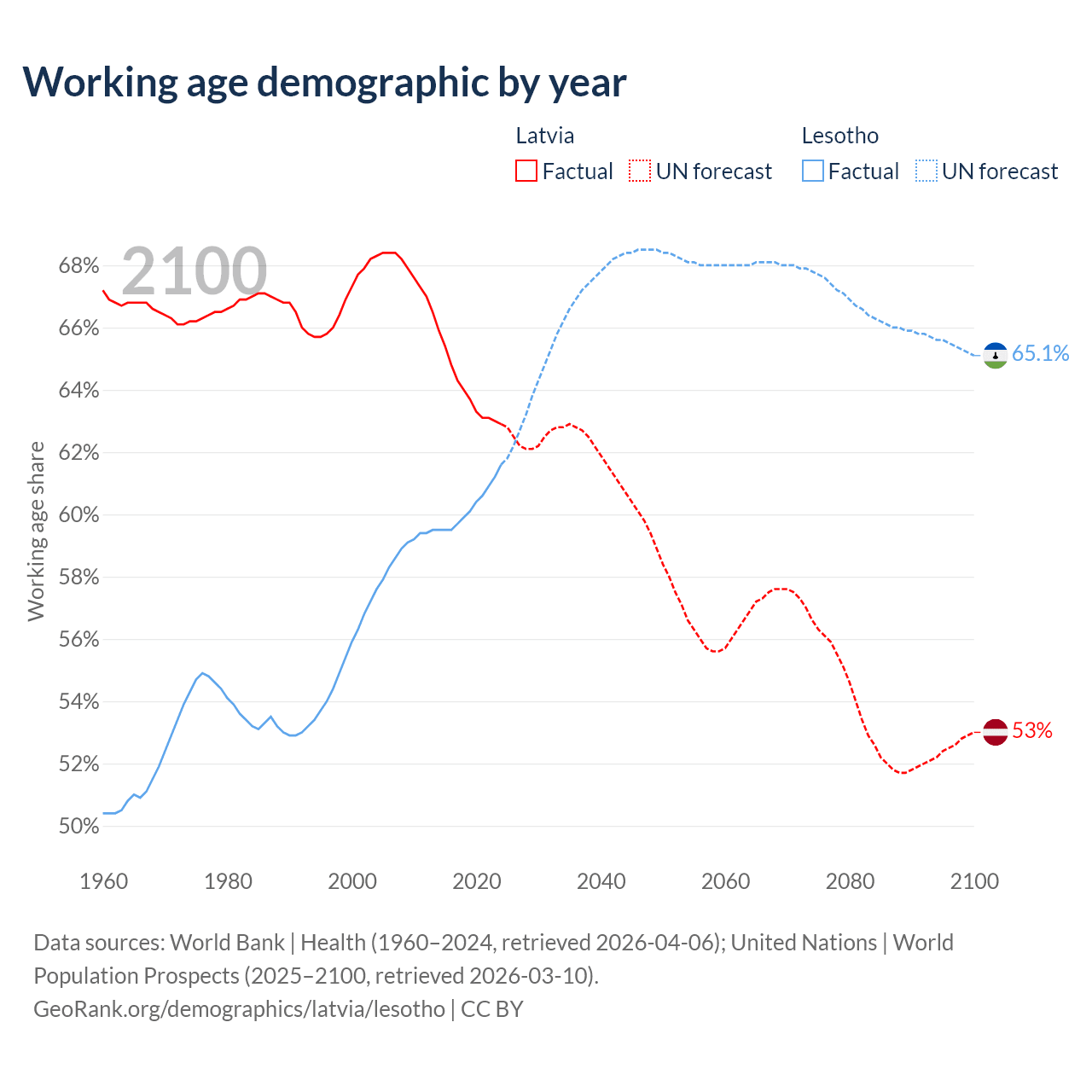 Median age Latvia vs Lesotho, 1960-2100
