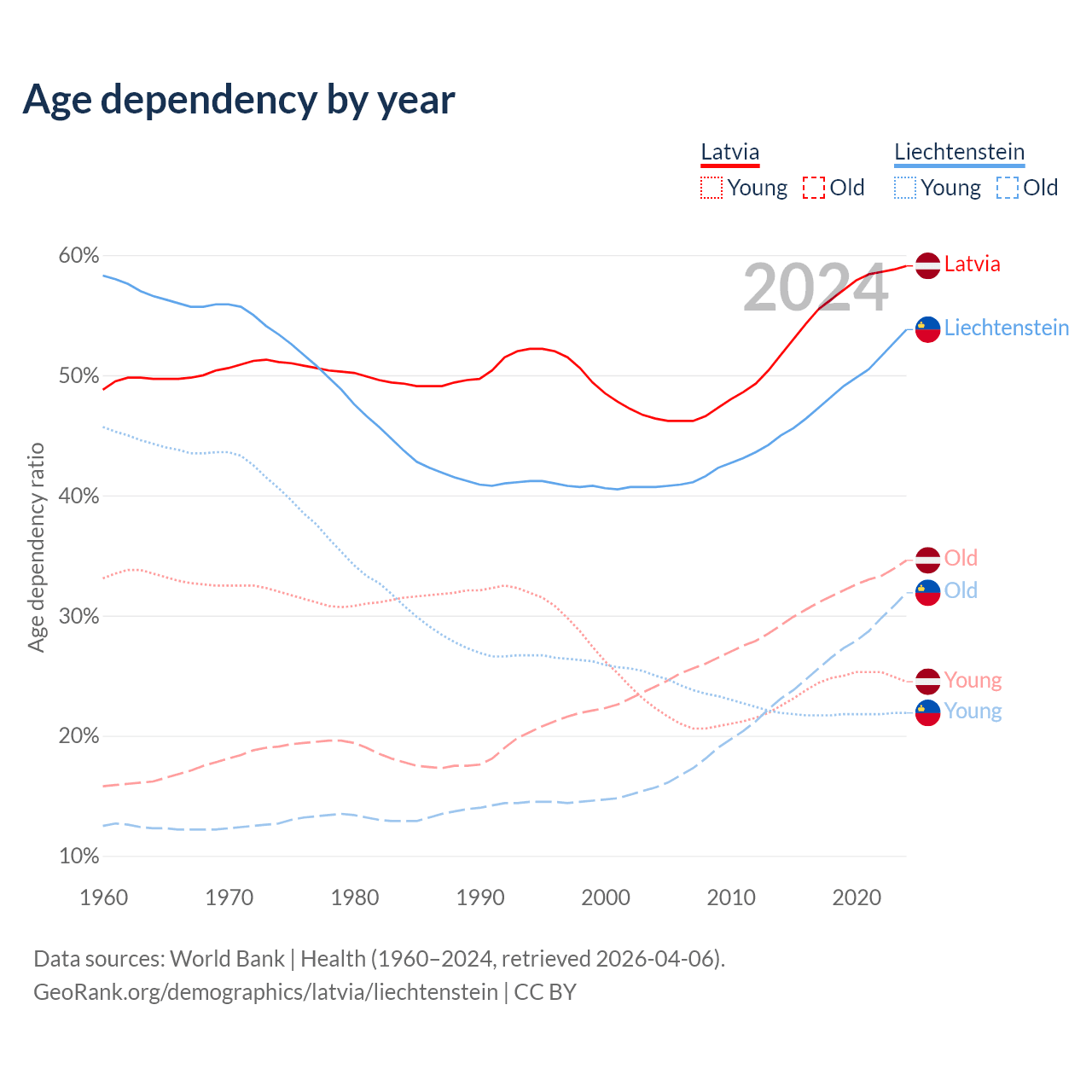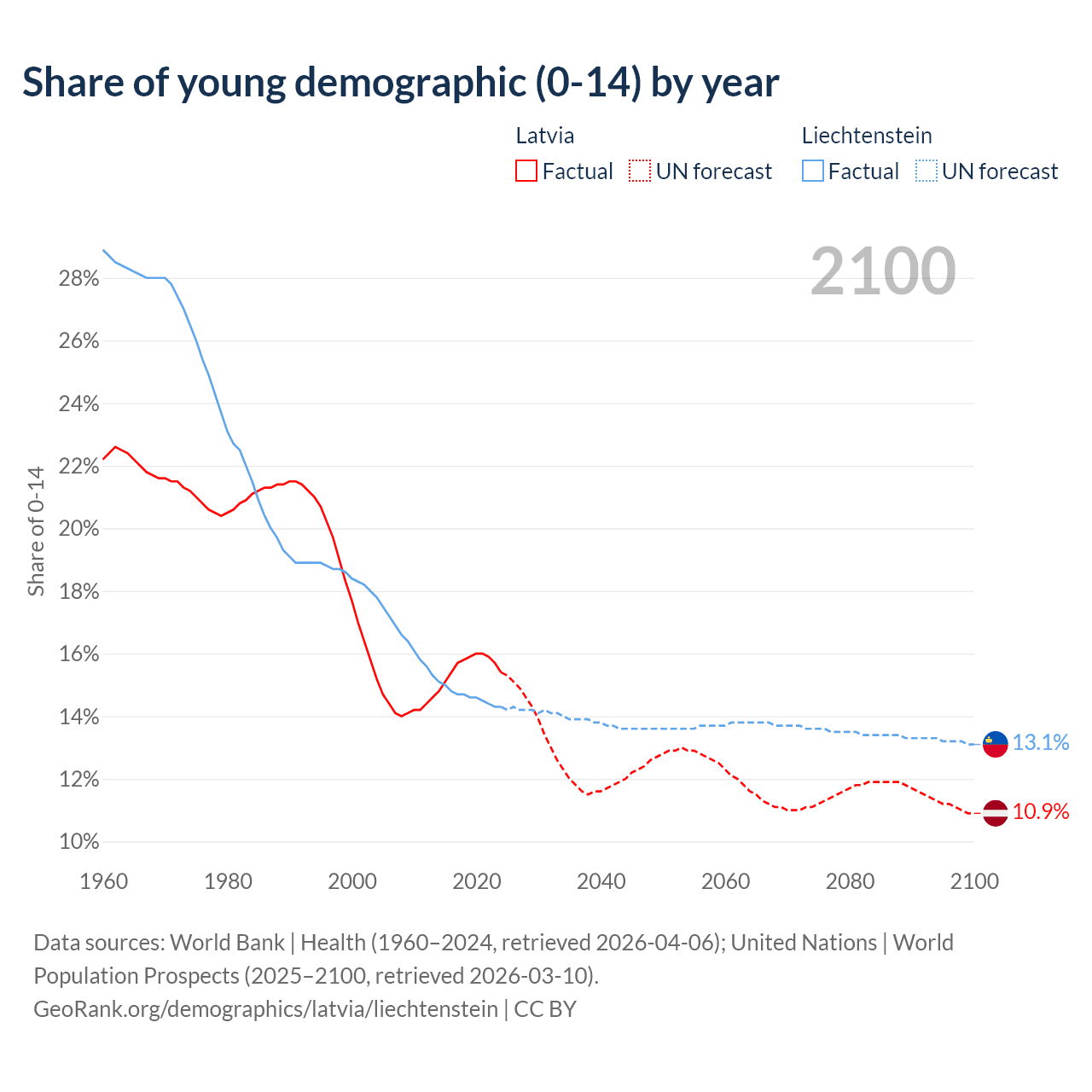 - The share of young demographic (0-15 years old) in Latvia is 15.4% vs 14.3% in Liechtenstein.