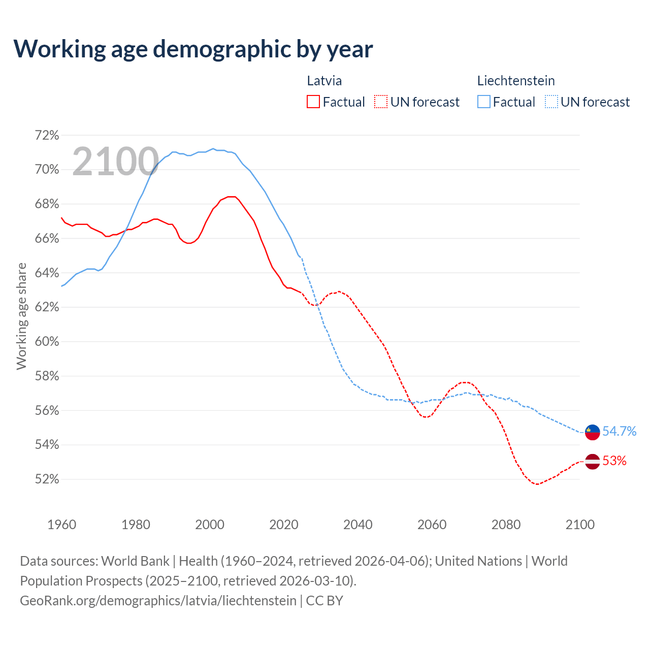 - Latvia has 1.15M working age adults (aged 15-64) vs 26.7K in Liechtenstein.
