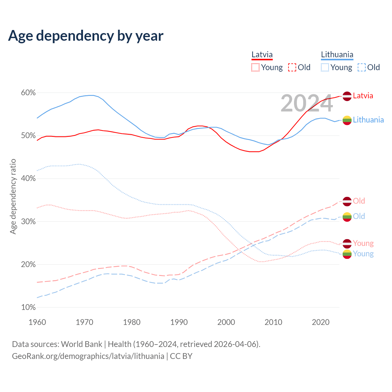 - Latvia is ranked 20/196 by median age (oldest to youngest) vs 28/196 for Lithuania.