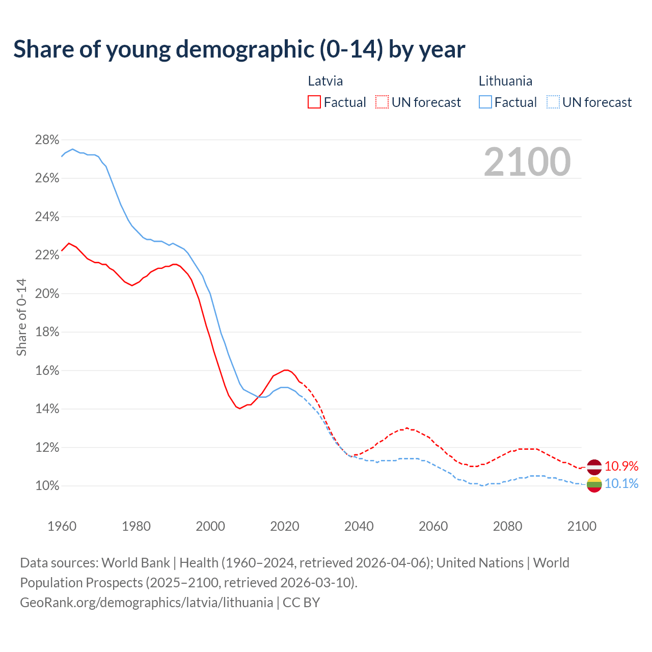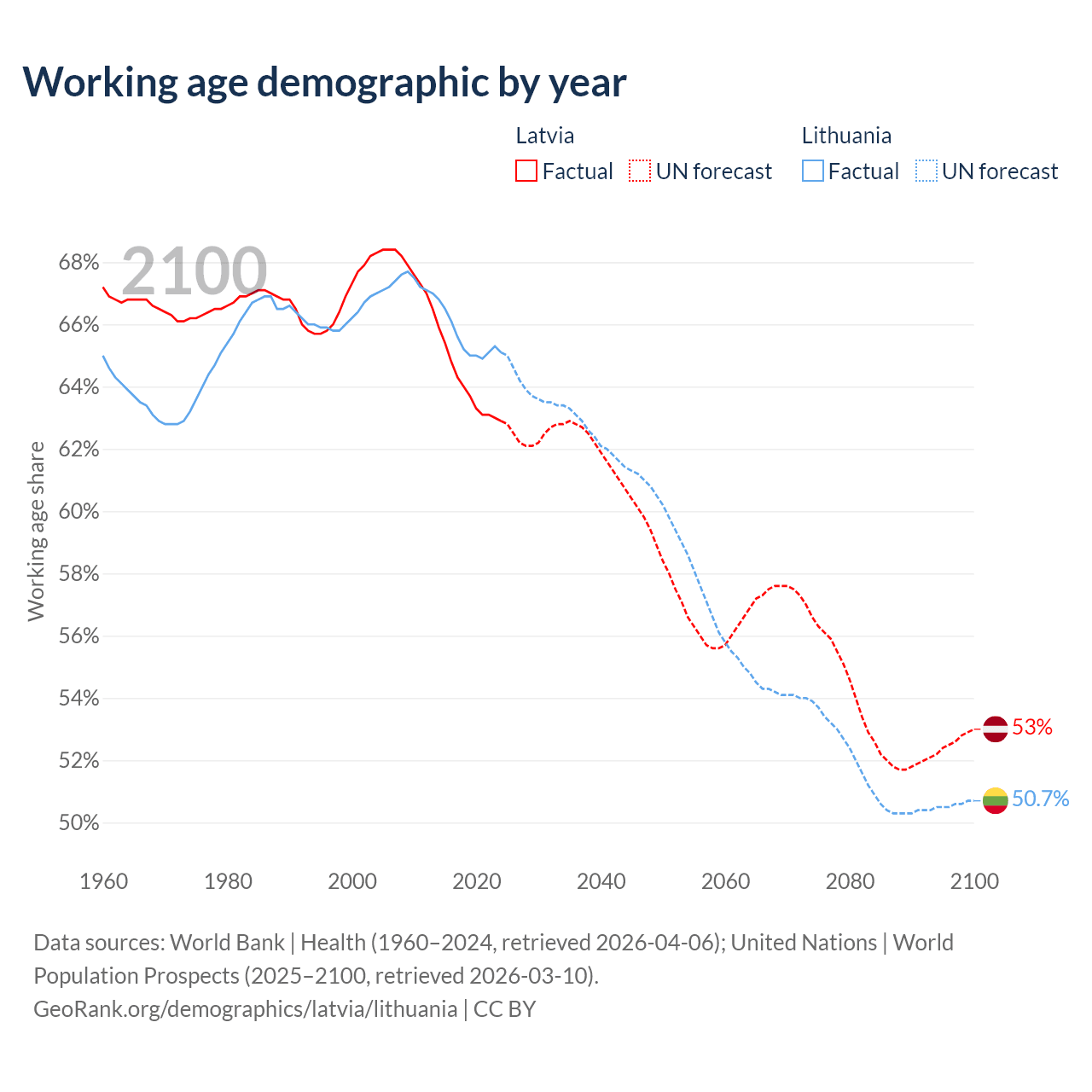 Median age Latvia vs Lithuania, 1960-2100