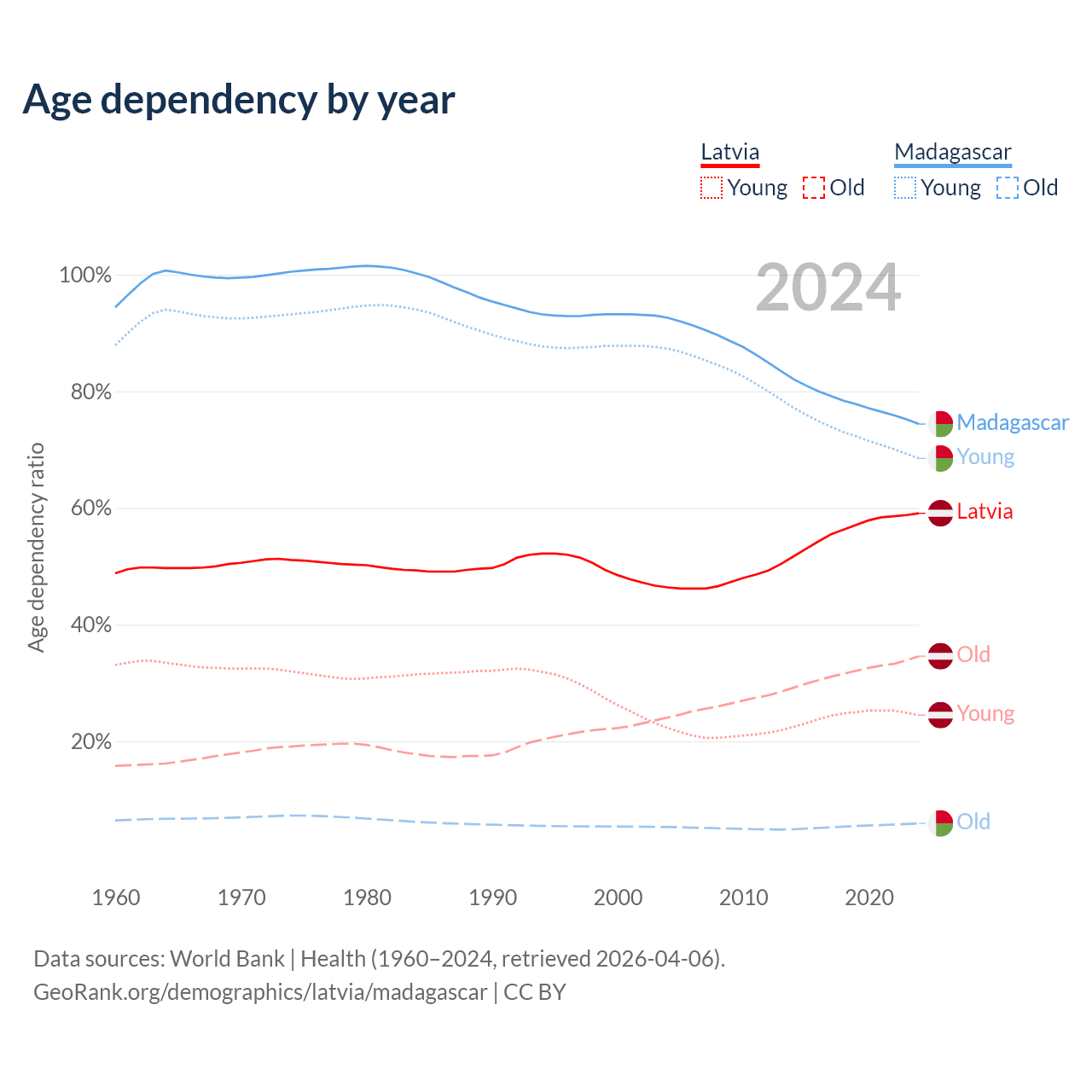 - Latvia is ranked 20/196 by median age (oldest to youngest) vs 165/196 for Madagascar.
