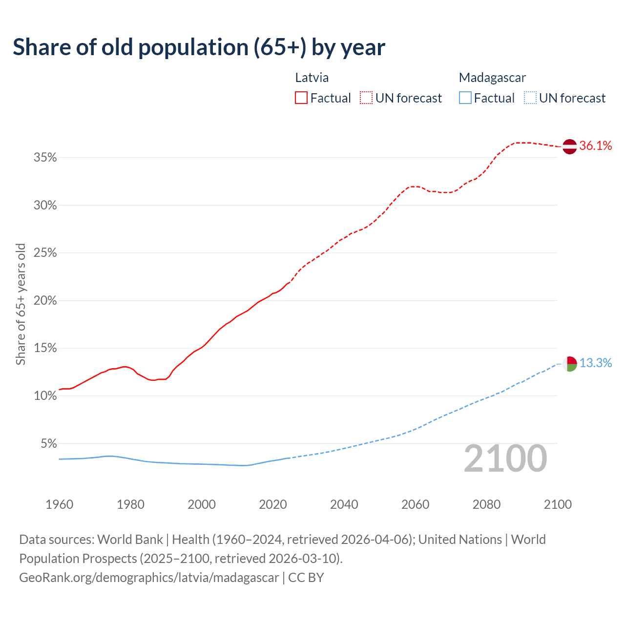 The share of older people aged 65 and over is 21.7% in Latvia and 3.41% in Madagascar. Life expectancy in Latvia compared to Madagascar .