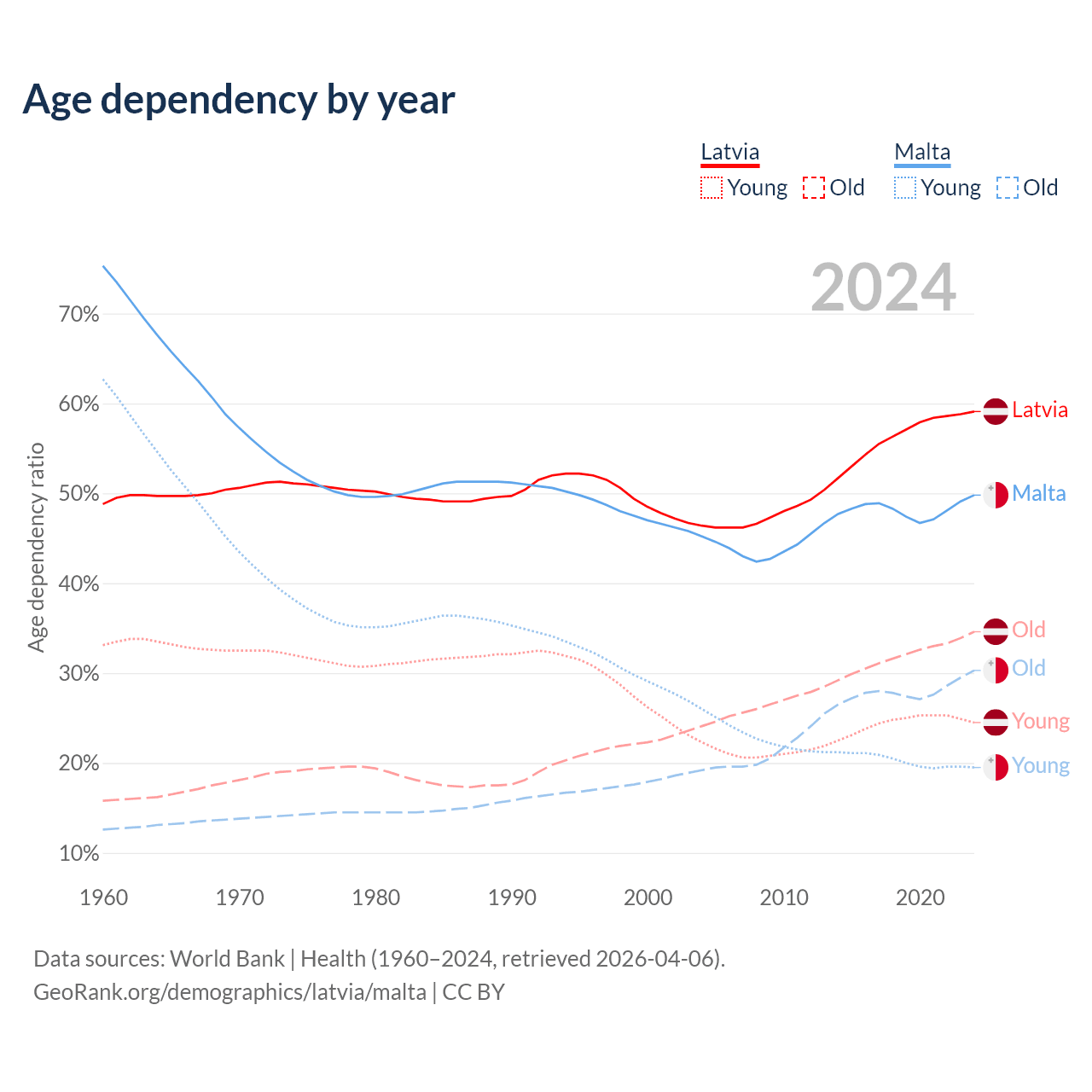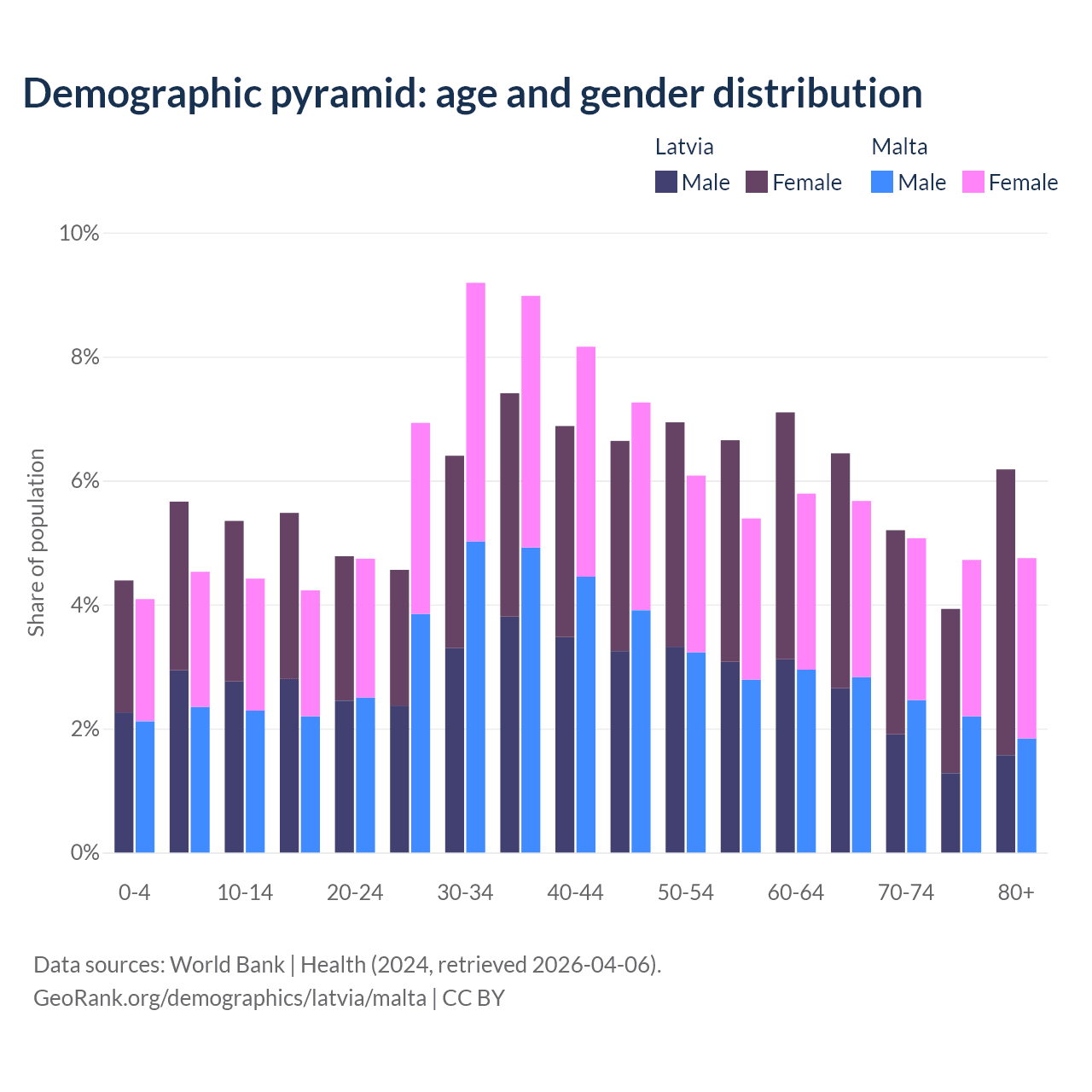 - Latvia is ranked 20/196 by median age (oldest to youngest) vs 36/196 for Malta.