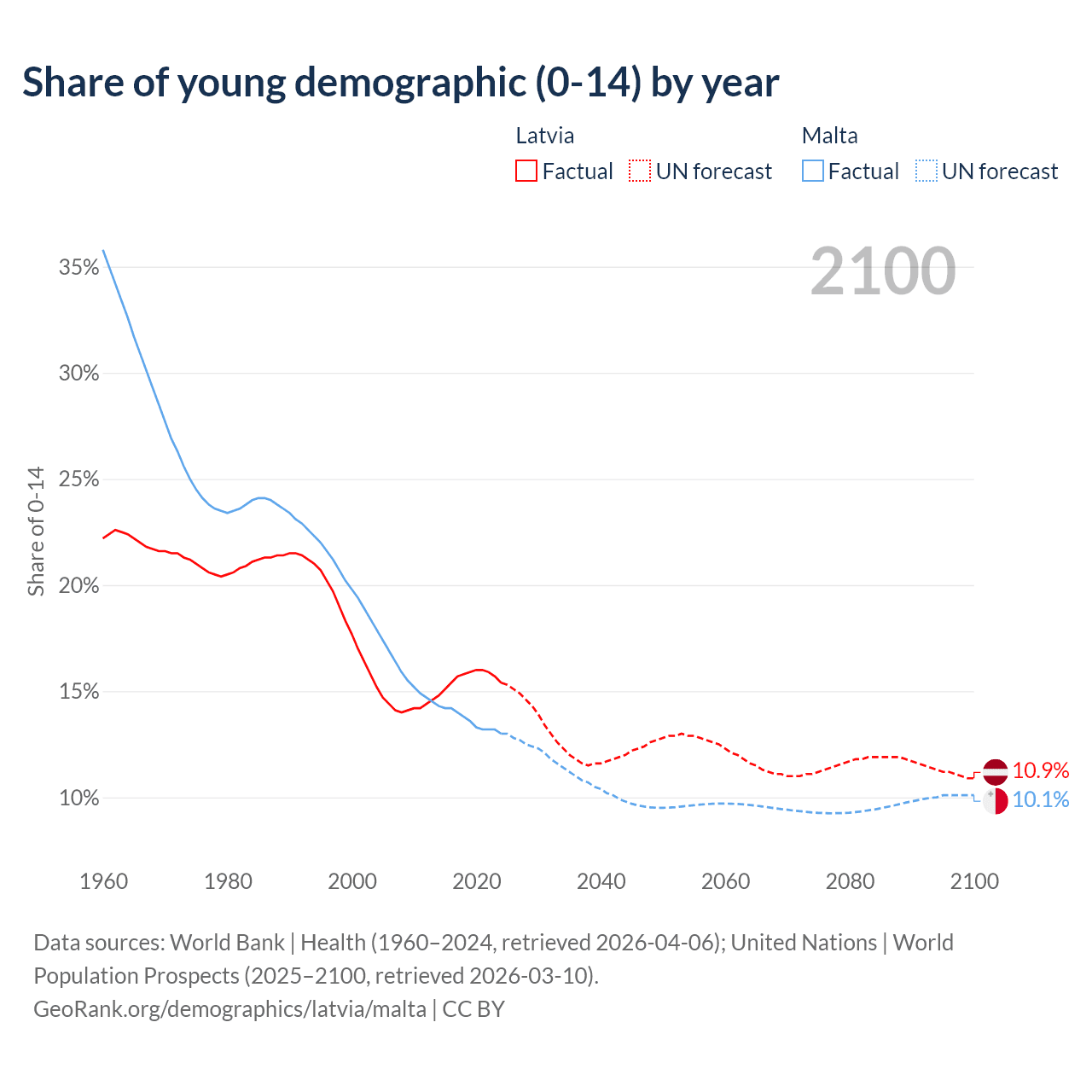 - The share of young demographic (0-15 years old) in Latvia is 15.4% vs 13% in Malta.
