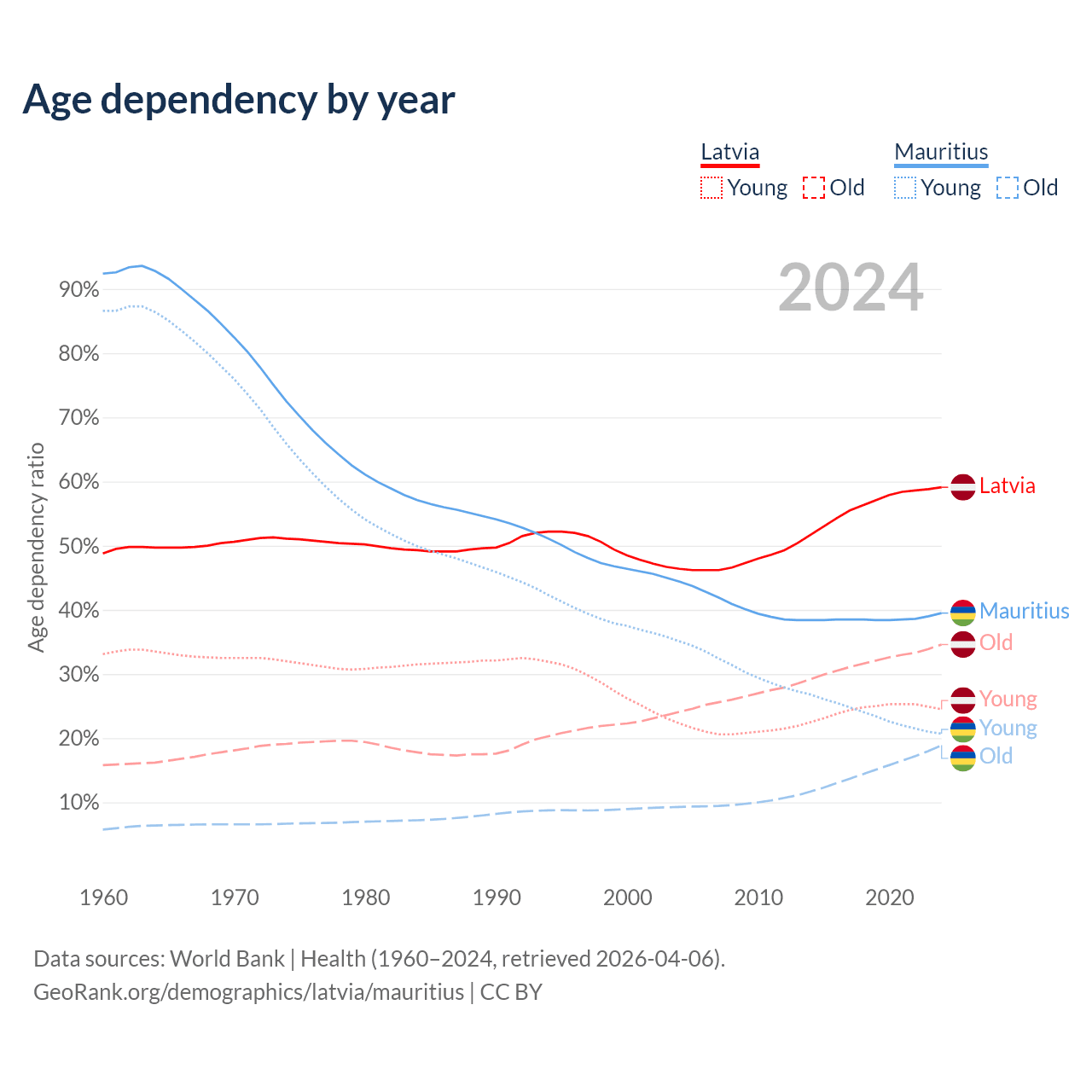 - Latvia is ranked 20/196 by median age (oldest to youngest) vs 57/196 for Mauritius.