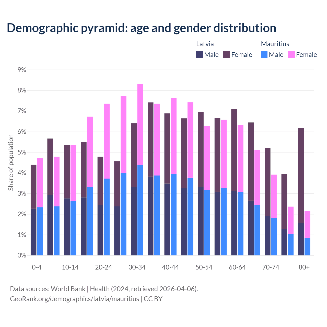 The share of older people aged 65 and over is 21.7% in Latvia and 13.5% in Mauritius. Life expectancy in Latvia compared to Mauritius .