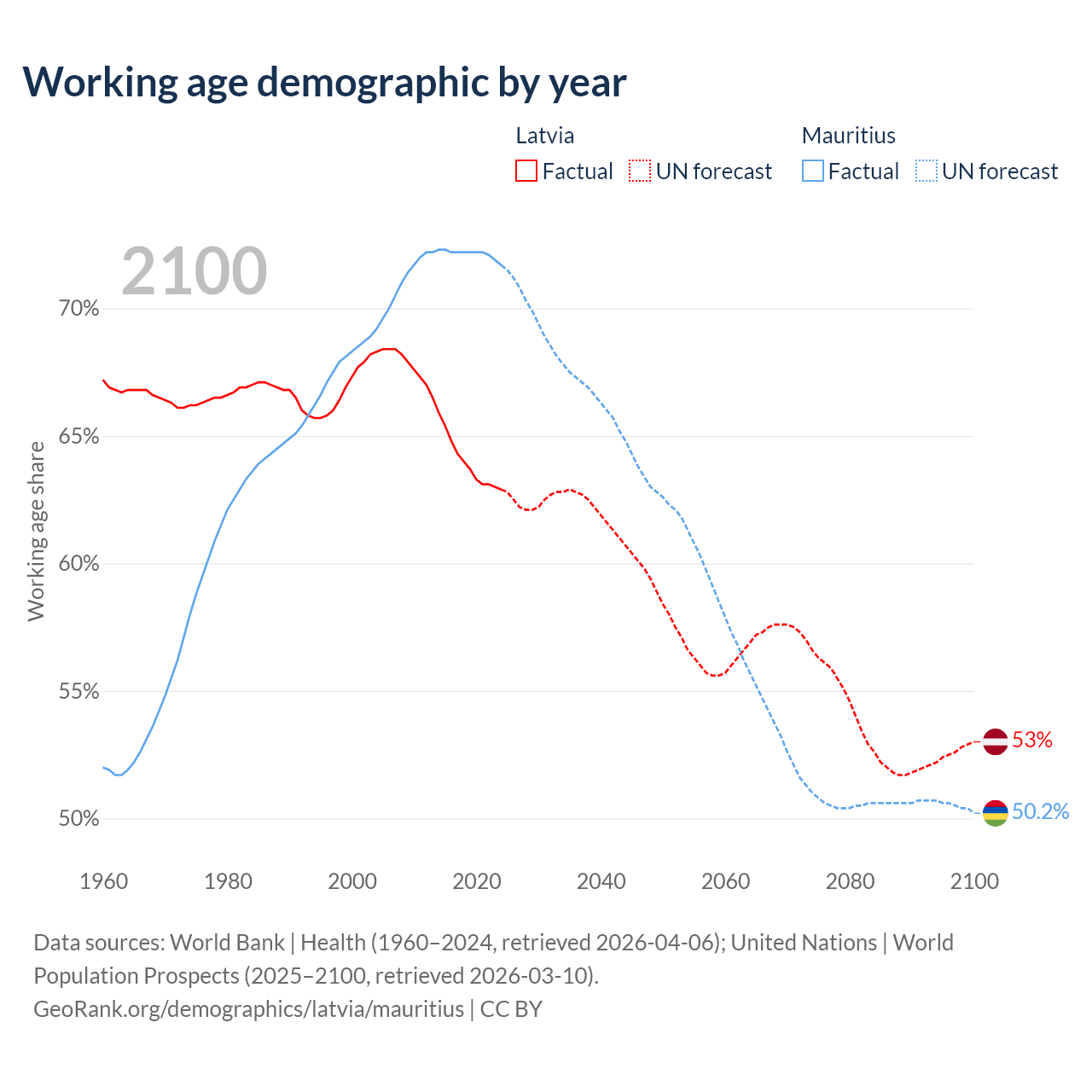 Median age Latvia vs Mauritius, 1960-2100