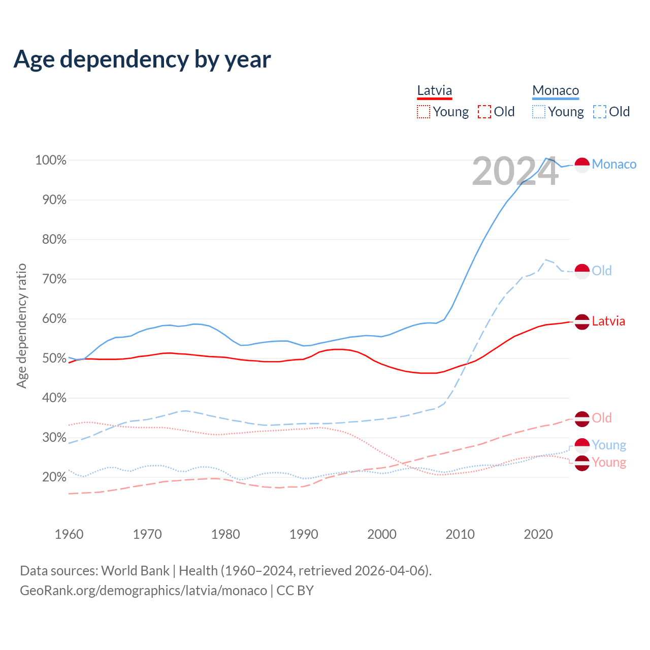 - Latvia is ranked 20/196 by median age (oldest to youngest) vs 1/196 for Monaco.