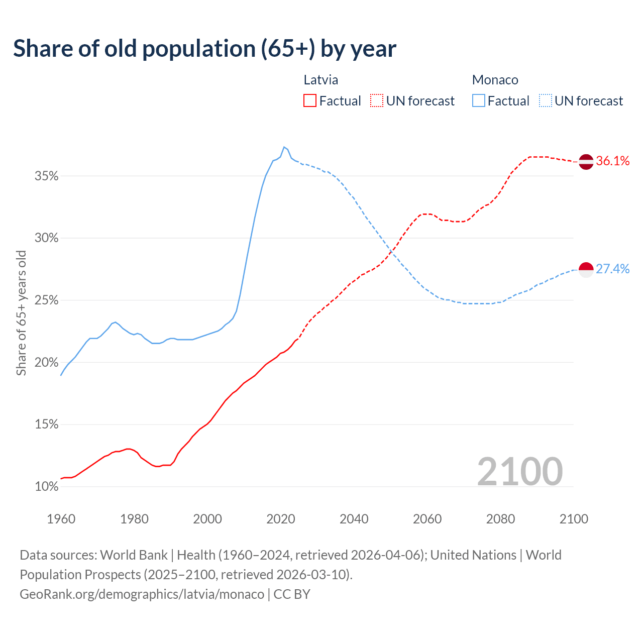 The share of older people aged 65 and over is 21.7% in Latvia and 36.2% in Monaco. Life expectancy in Latvia compared to Monaco .
