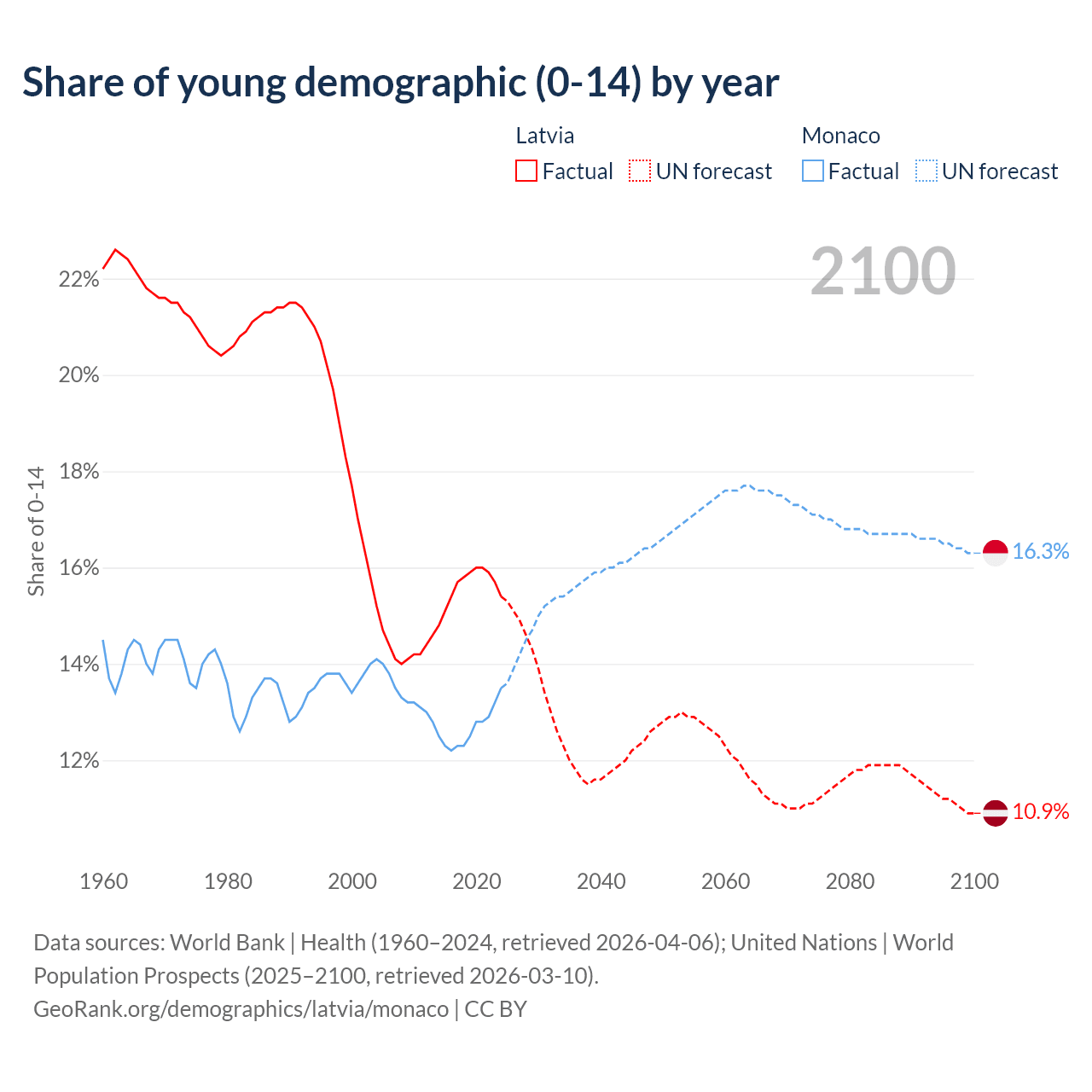 - The share of young demographic (0-15 years old) in Latvia is 15.4% vs 13.5% in Monaco.