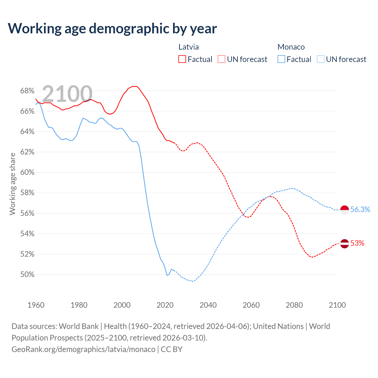 Median age Latvia vs Monaco, 1960-2100