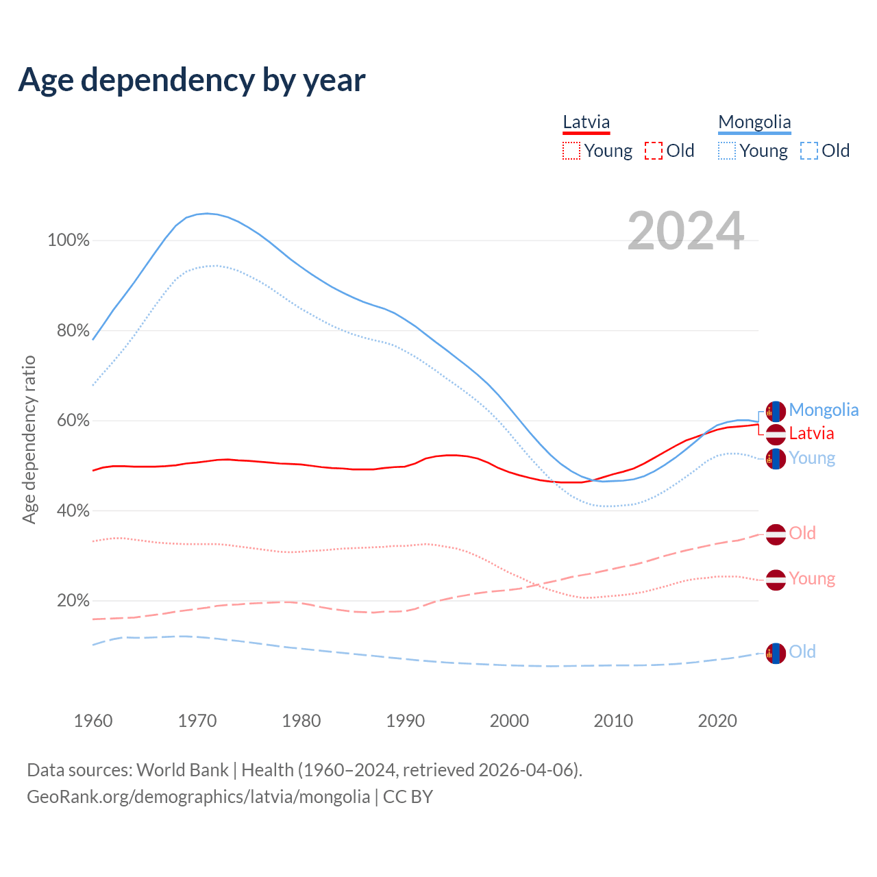 - Latvia is ranked 20/196 by median age (oldest to youngest) vs 117/196 for Mongolia.
