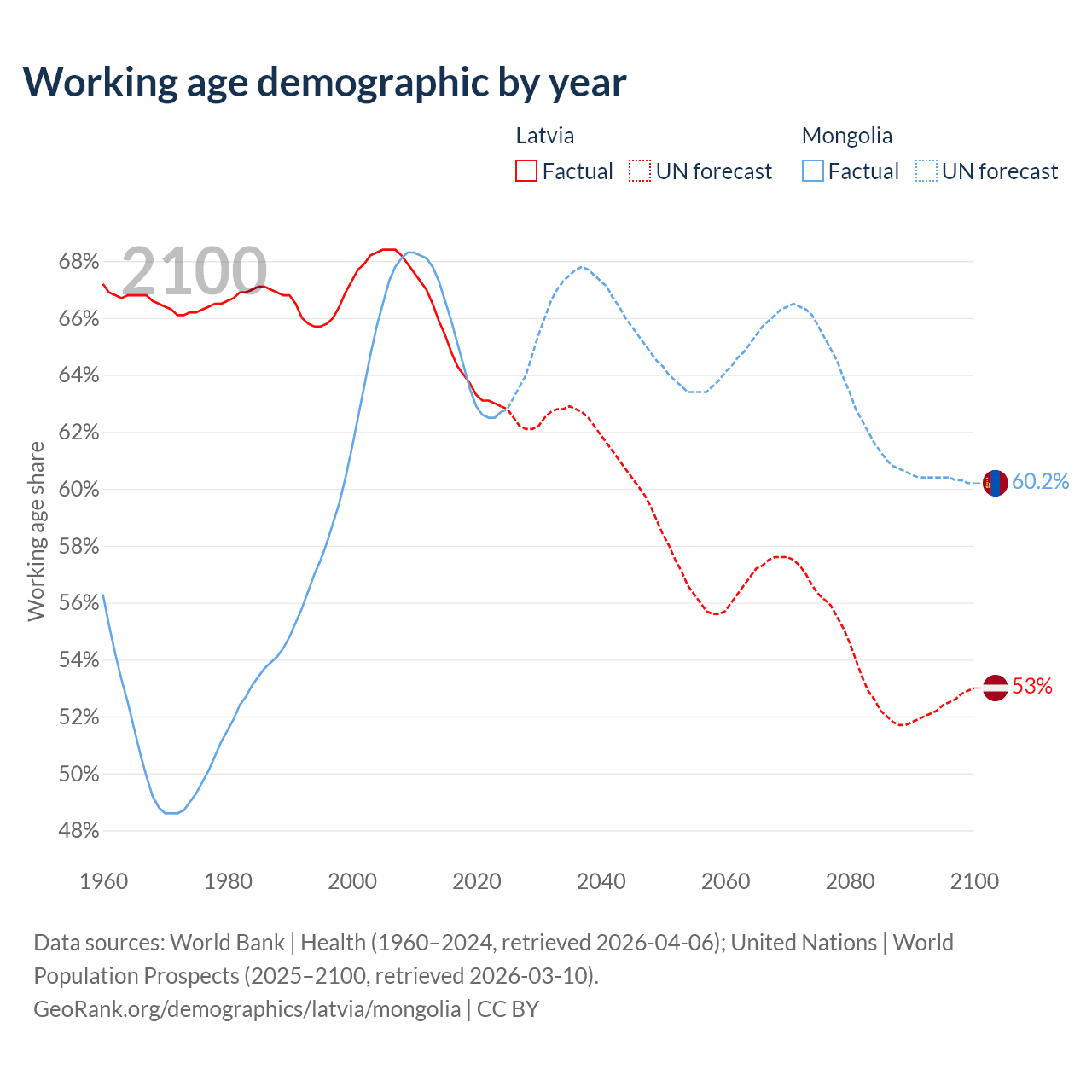 Median age Latvia vs Mongolia, 1960-2100
