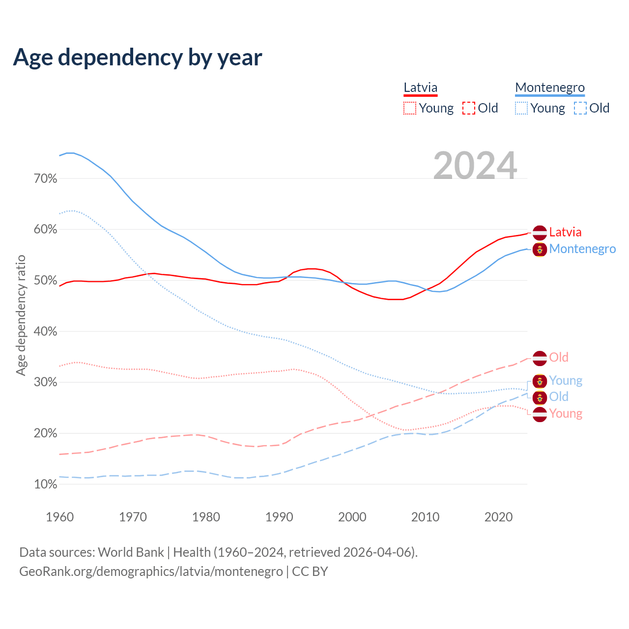 - Latvia is ranked 20/196 by median age (oldest to youngest) vs 45/196 for Montenegro.