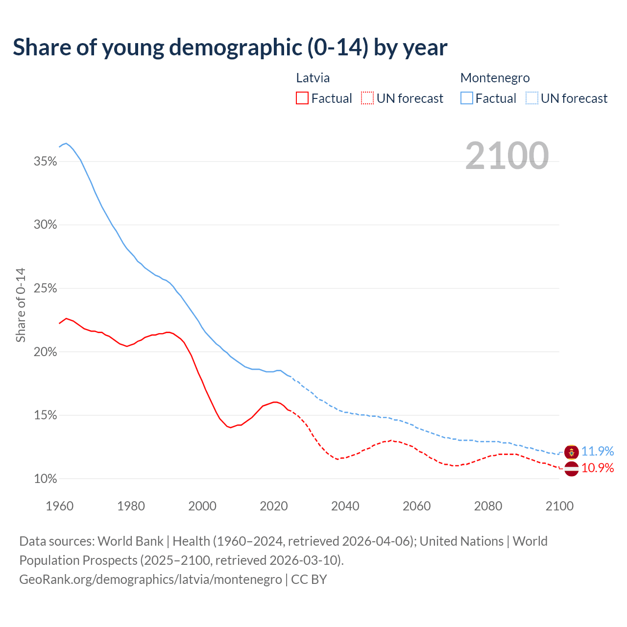 - The share of young demographic (0-15 years old) in Latvia is 15.4% vs 18.1% in Montenegro.