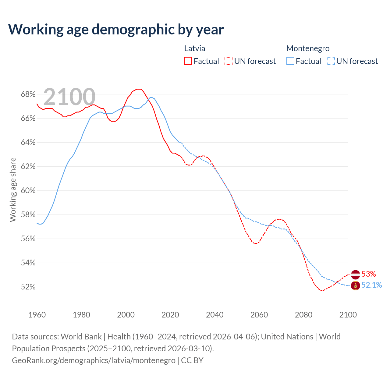 Median age Latvia vs Montenegro, 1960-2100