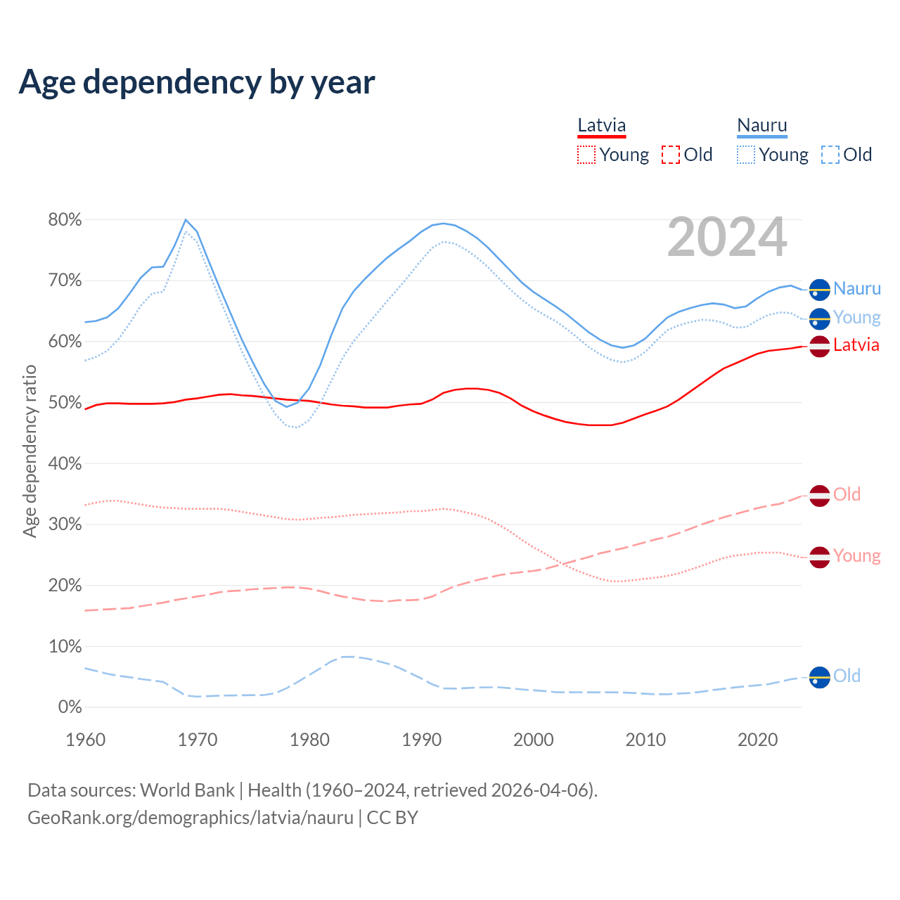 - The share of old-age demographic (65+) in Latvia is 21.7% vs 2.85% in Nauru.