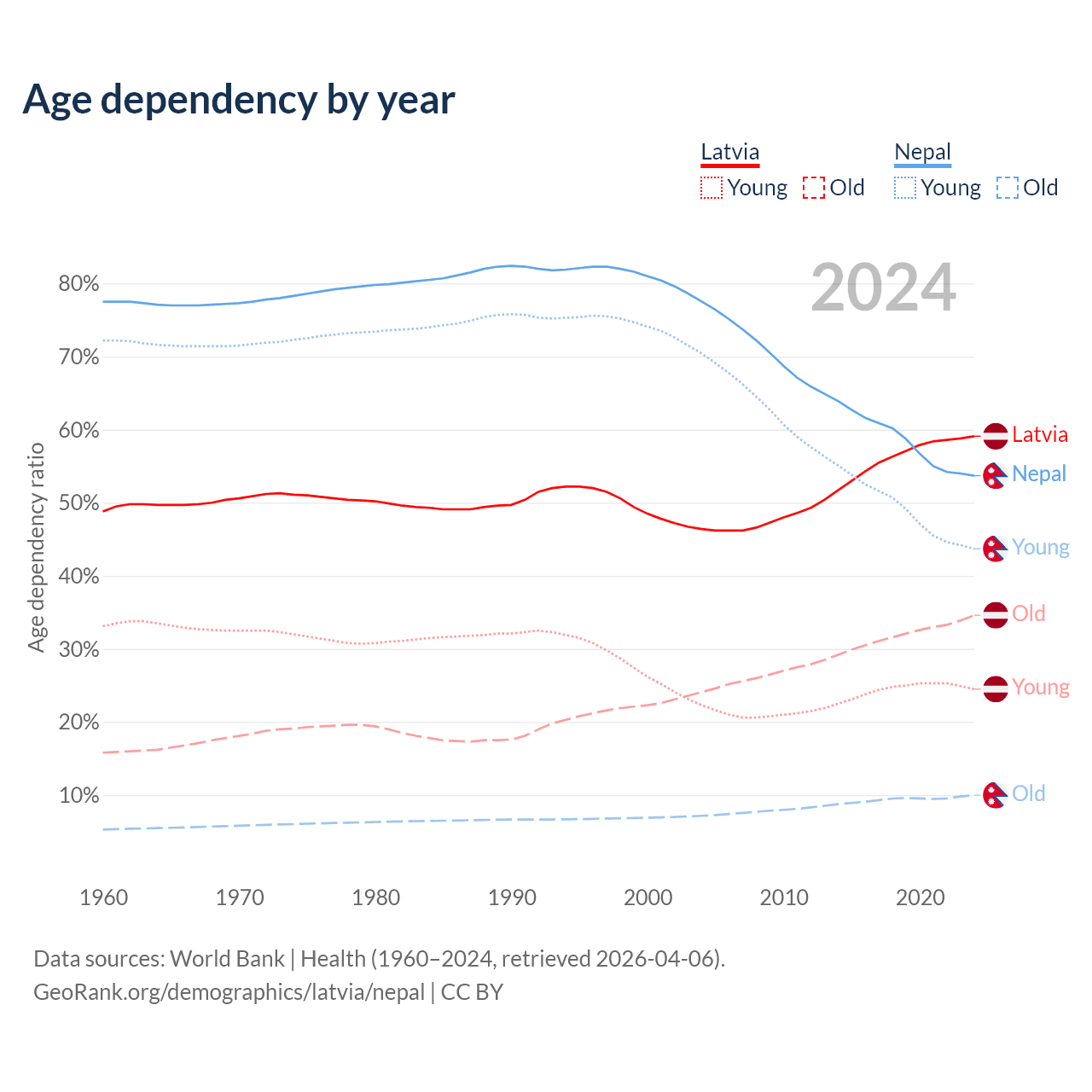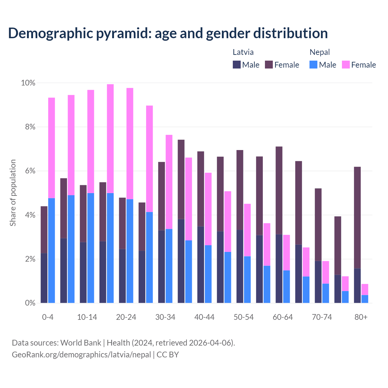 - Latvia is ranked 20/196 by median age (oldest to youngest) vs 127/196 for Nepal.