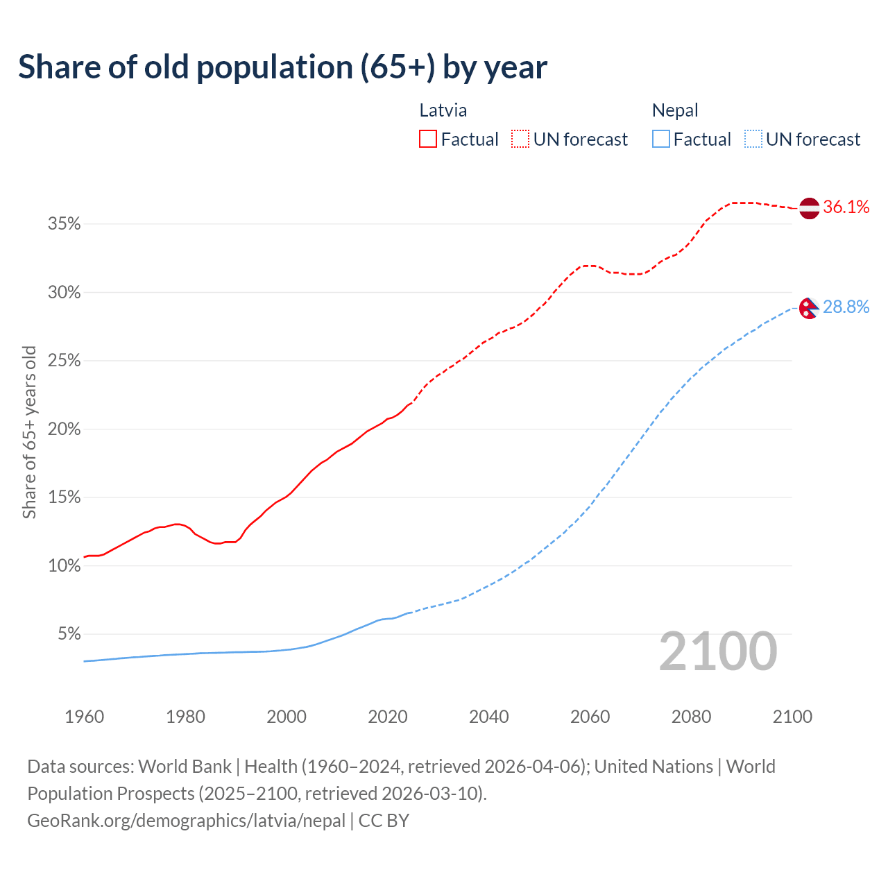 - The share of old-age demographic (65+) in Latvia is 21.7% vs 6.5% in Nepal.