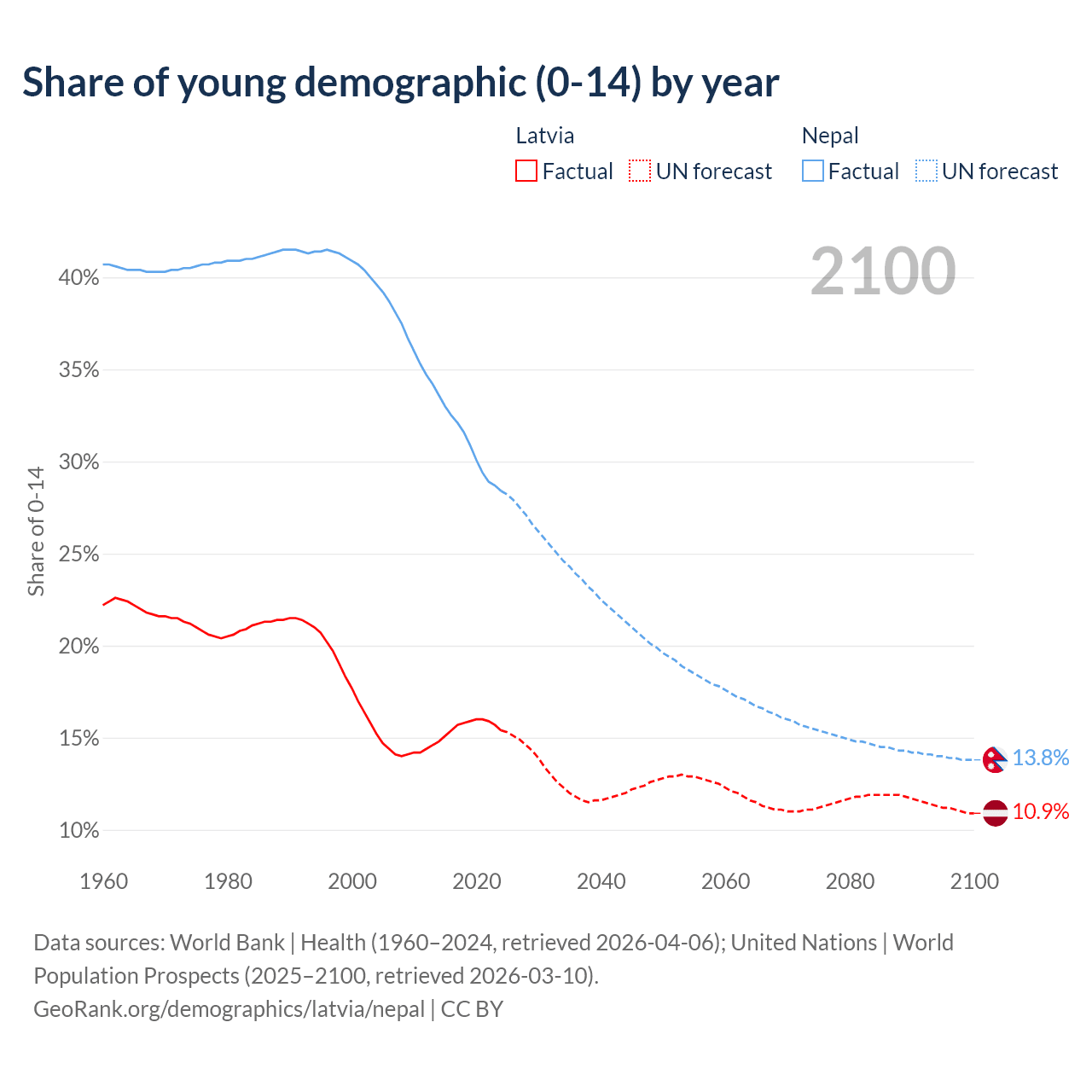 - The share of young demographic (0-15 years old) in Latvia is 15.4% vs 28.4% in Nepal.