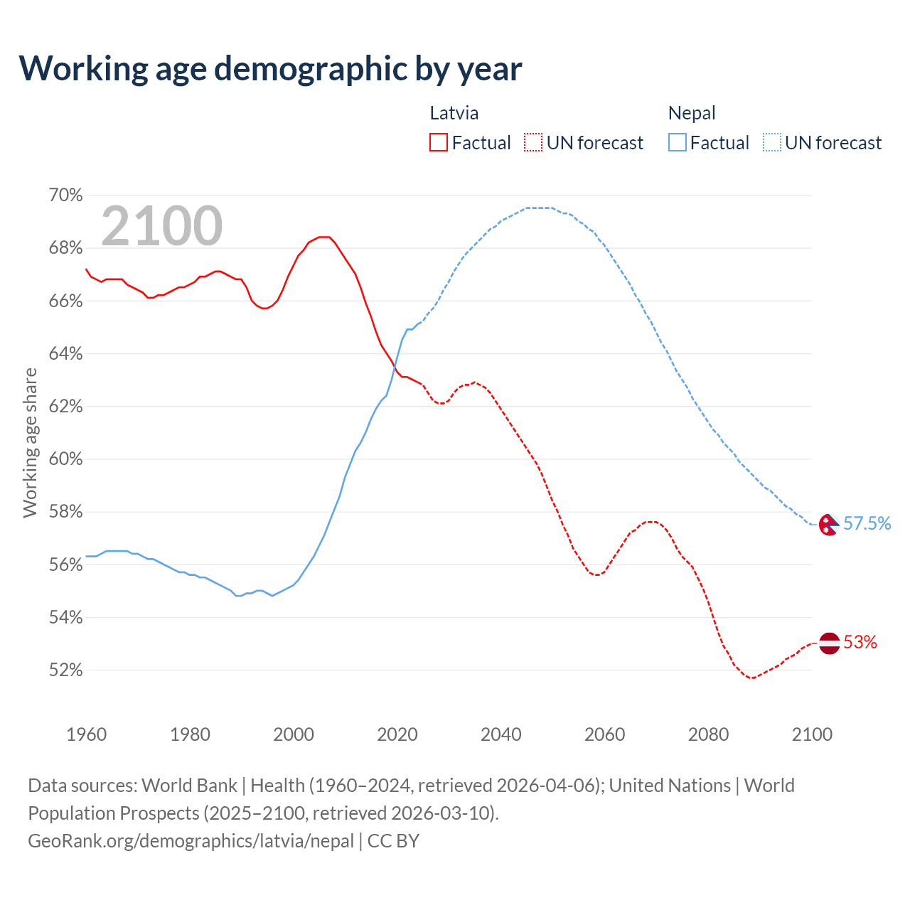 - Latvia has 1.15M working age adults (aged 15-64) vs 19.3M in Nepal.