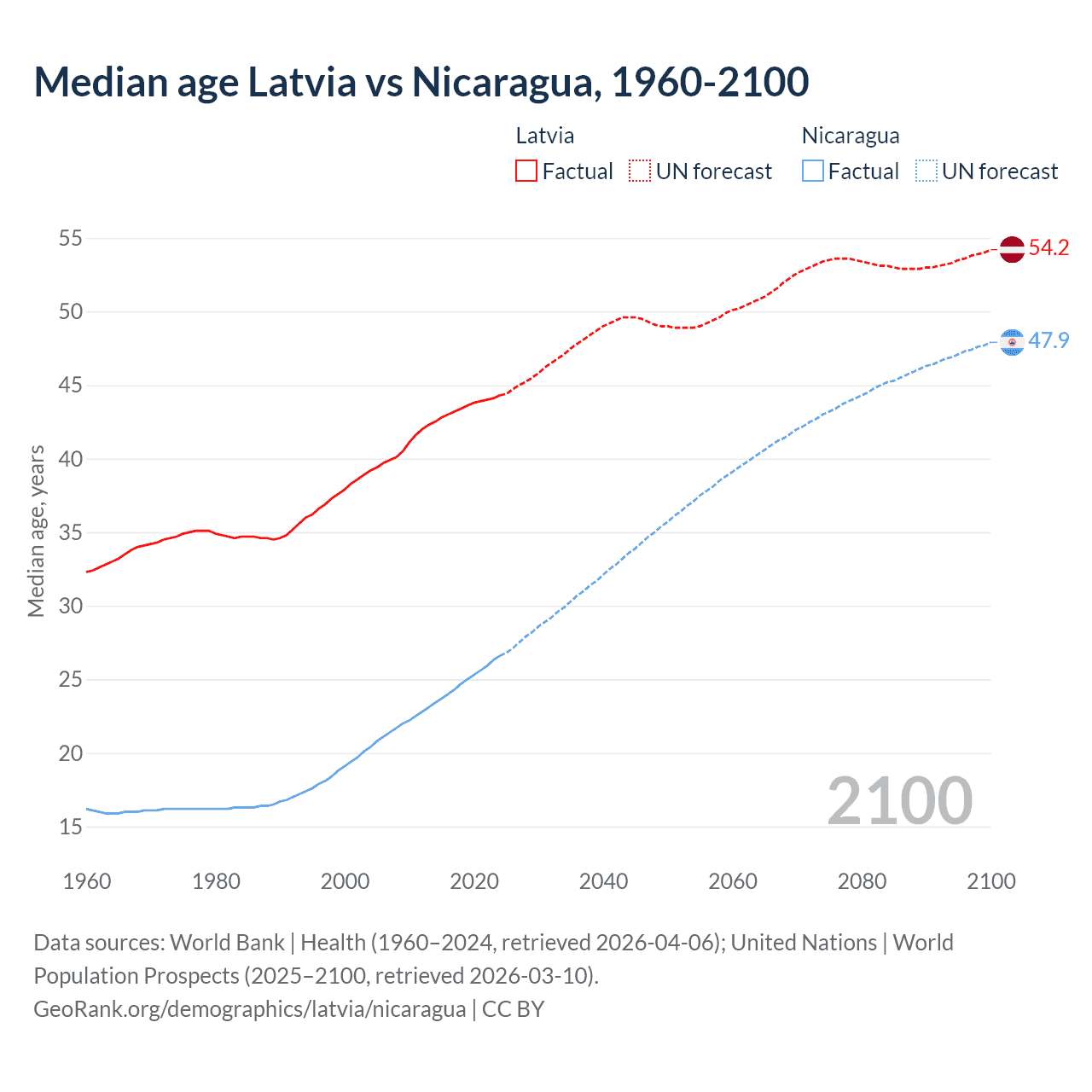 Median age Latvia vs Nicaragua, 1960-2100