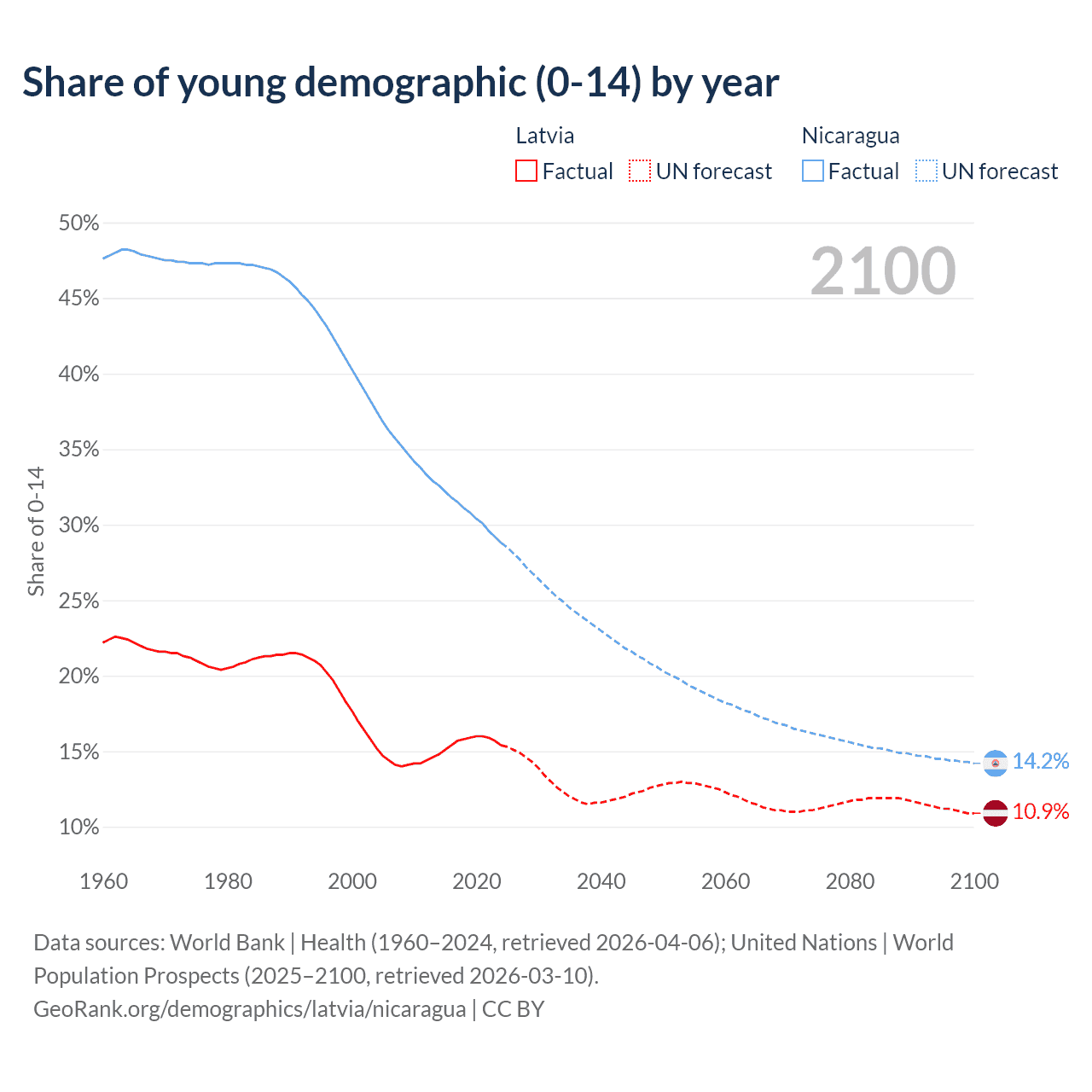 - The share of young demographic (0-15 years old) in Latvia is 15.4% vs 28.8% in Nicaragua.