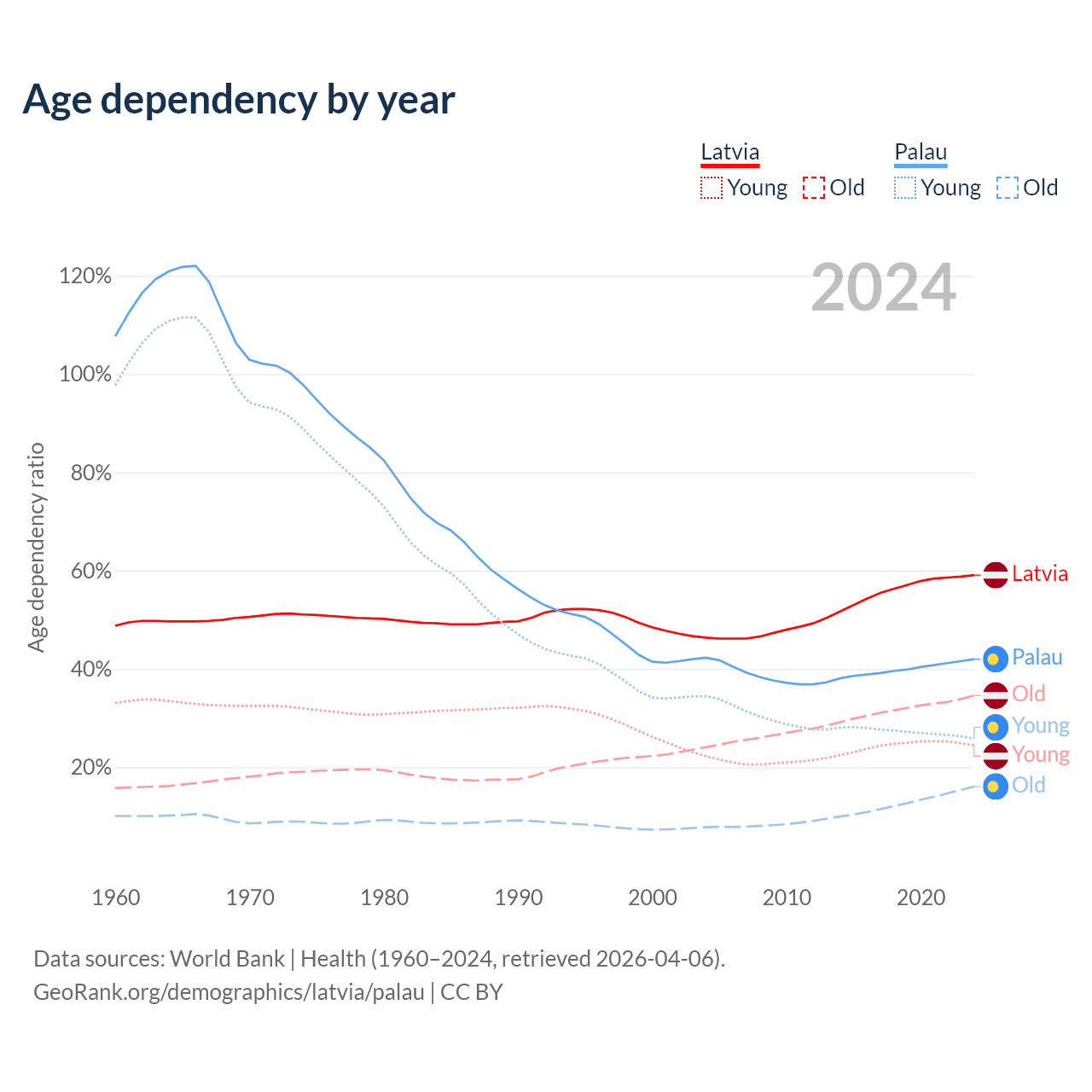 - The share of old-age demographic (65+) in Latvia is 21.7% vs 11.3% in Palau.