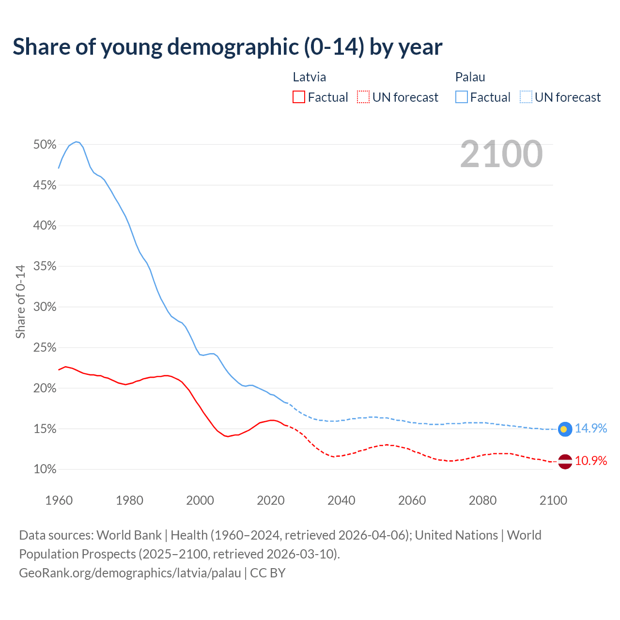 - The share of young demographic (0-15 years old) in Latvia is 15.4% vs 18.2% in Palau.