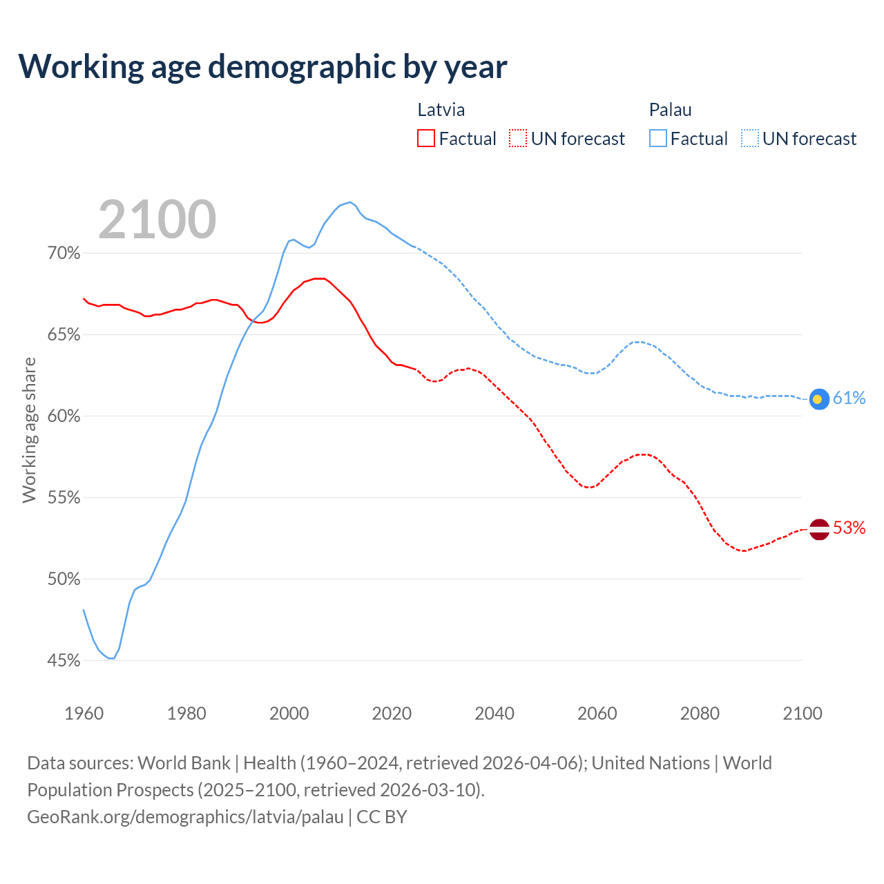 - Latvia has 1.15M working age adults (aged 15-64) vs 12.4K in Palau.