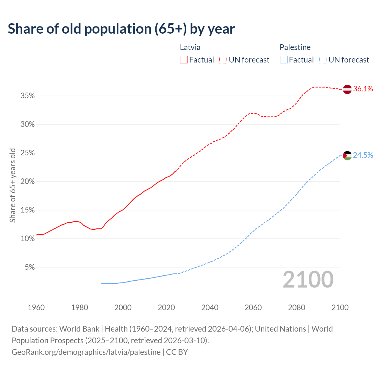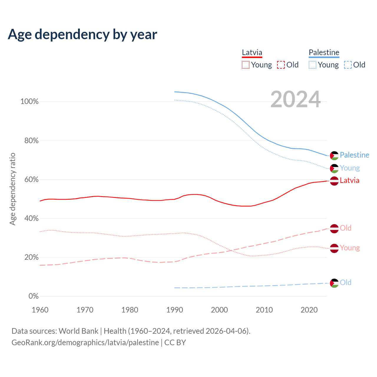 - The share of old-age demographic (65+) in Latvia is 21.7% vs 3.84% in Palestine.
