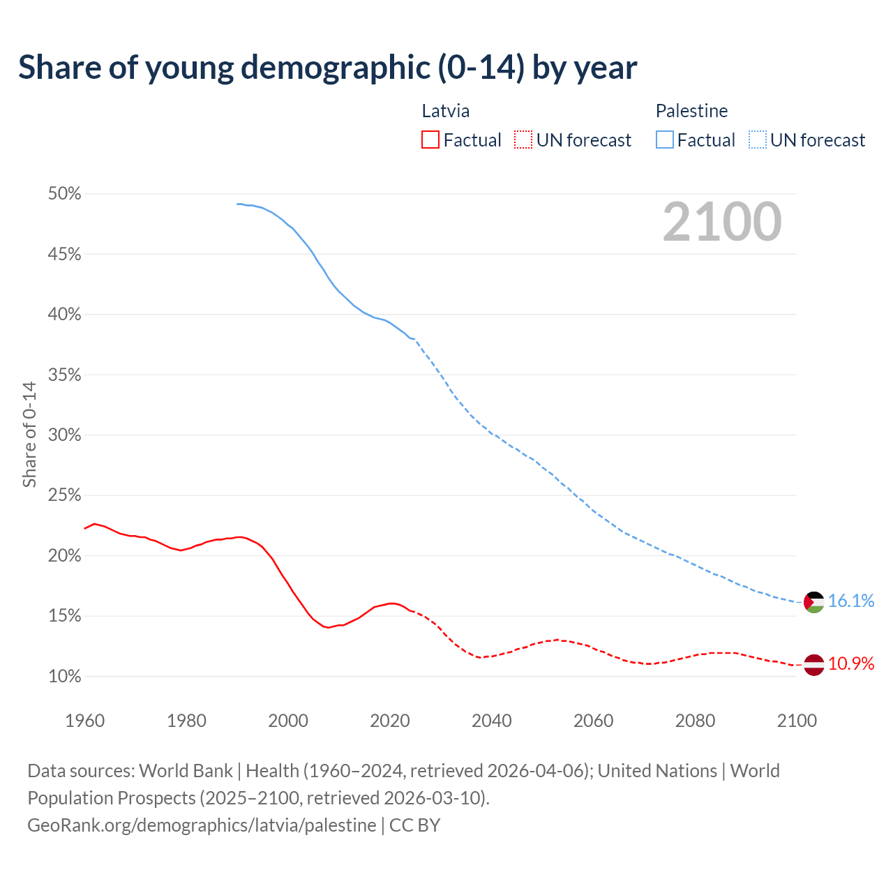 - The share of young demographic (0-15 years old) in Latvia is 15.4% vs 38% in Palestine.