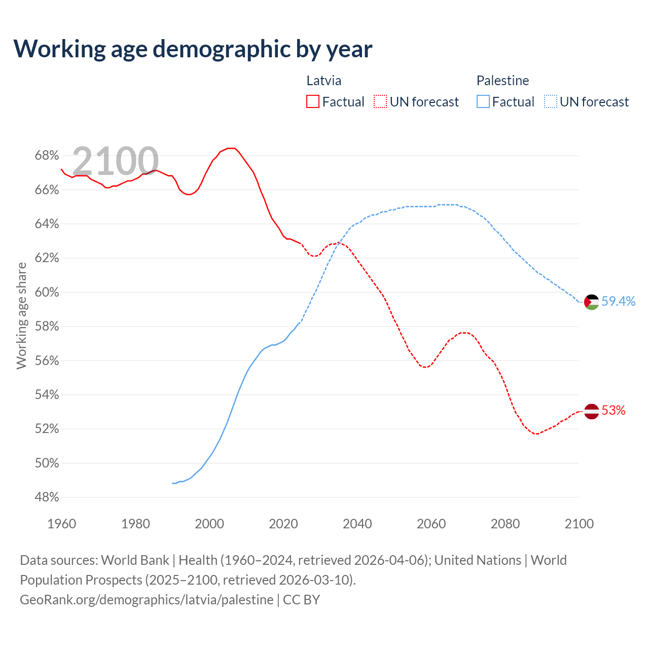 Median age Latvia vs Palestine, 1960-2100