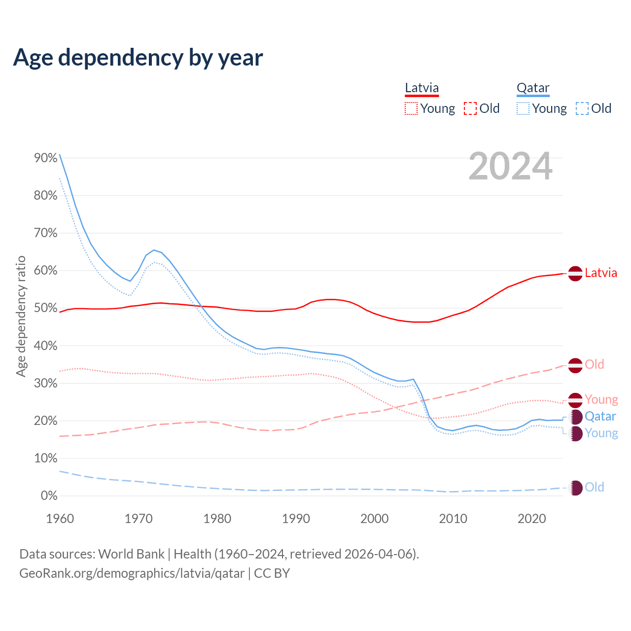 - Latvia is ranked 20/196 by median age (oldest to youngest) vs 78/196 for Qatar.