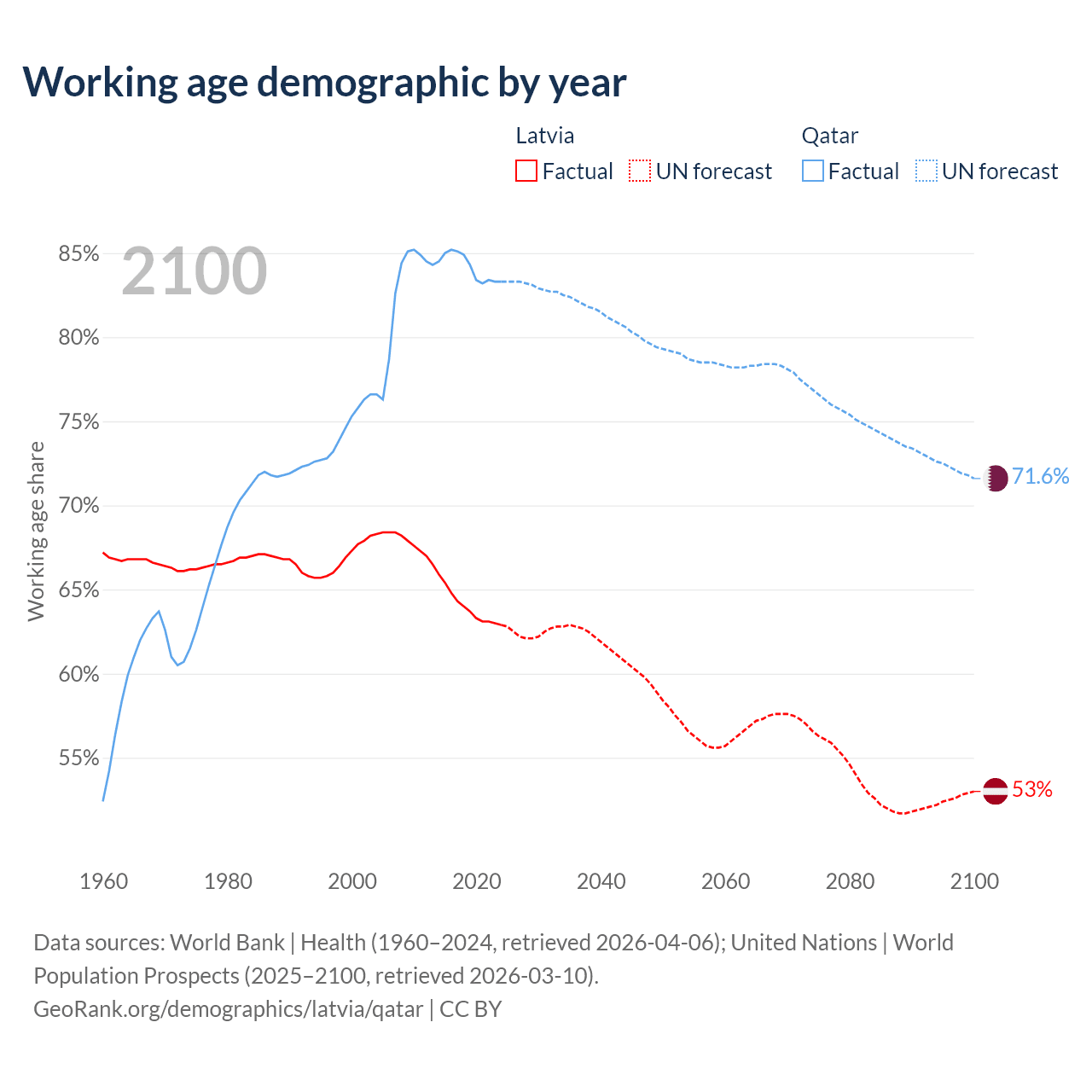 Median age Latvia vs Qatar, 1960-2100