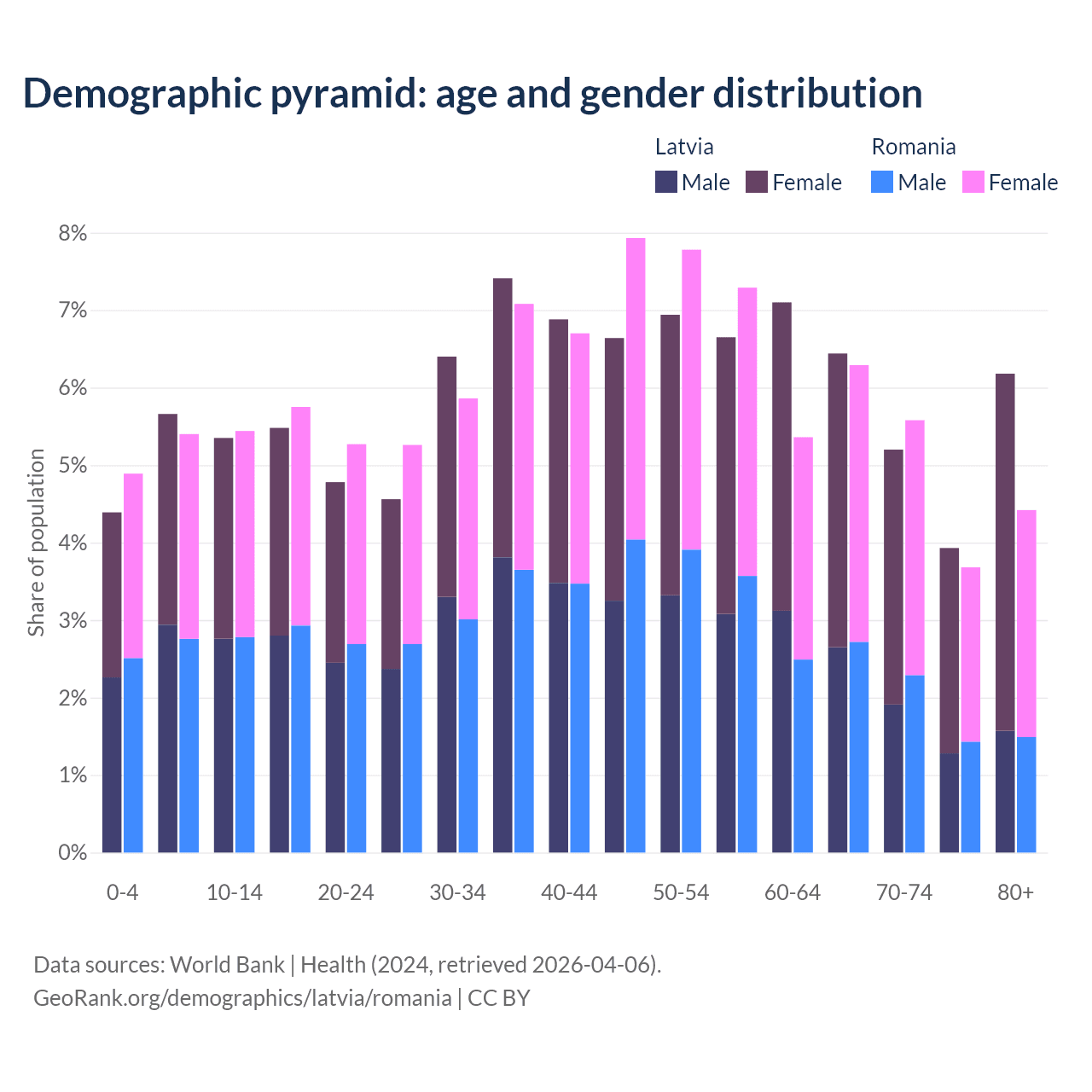 - Latvia is ranked 20/196 by median age (oldest to youngest) vs 23/196 for Romania.